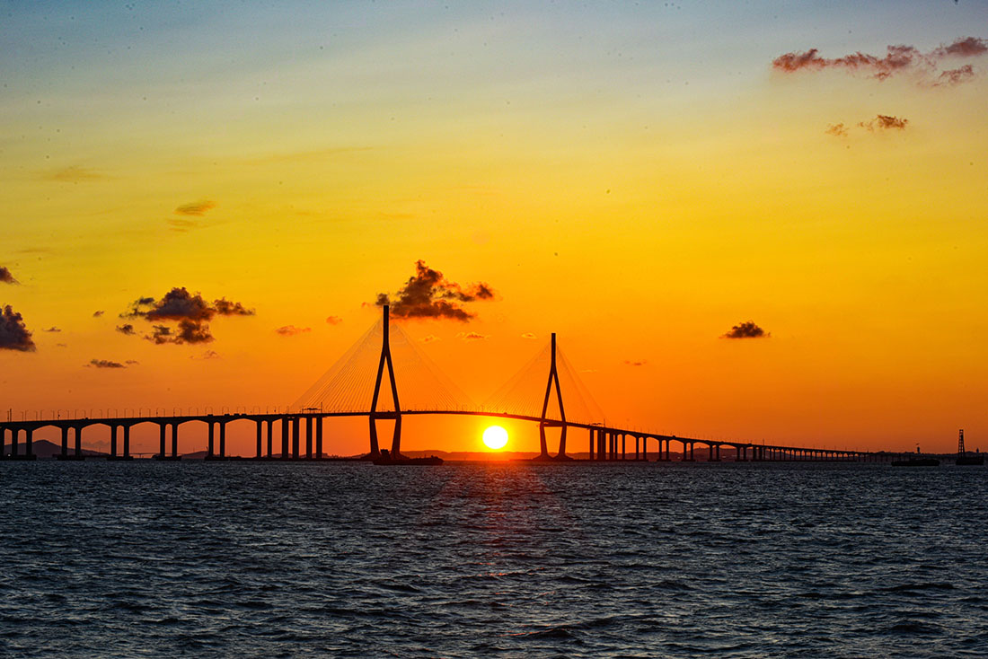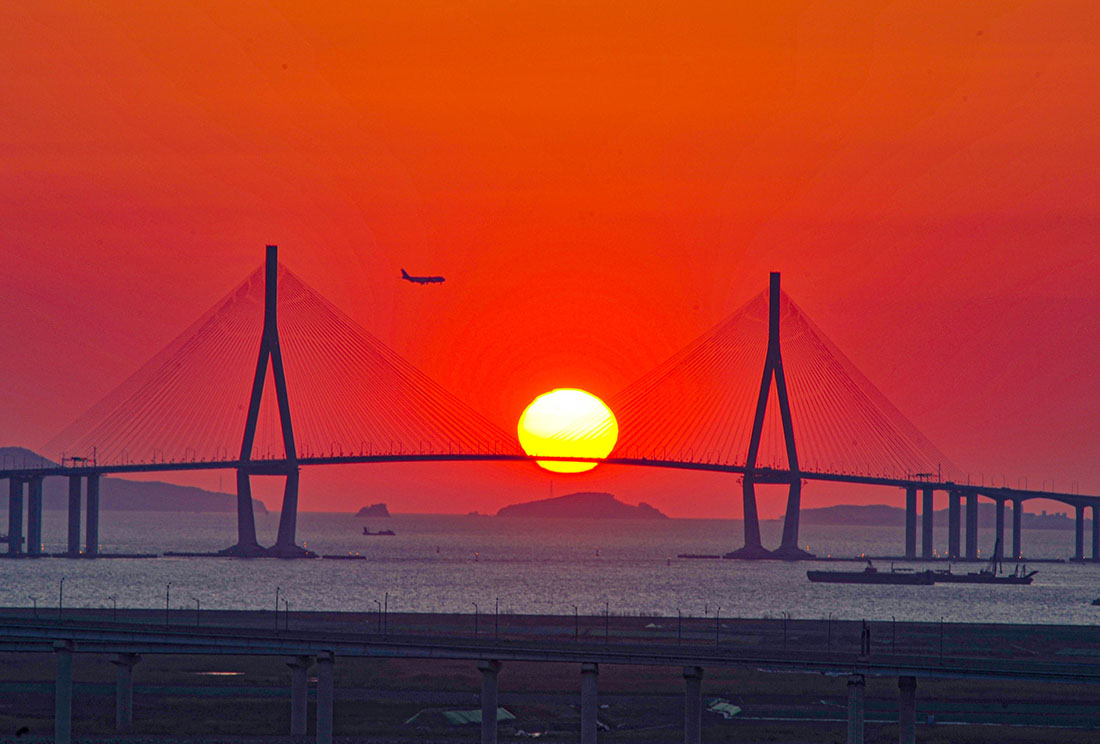 인천대교 주탑과 주탑사이 활처럼 위로 굽은 상판위로 지는
