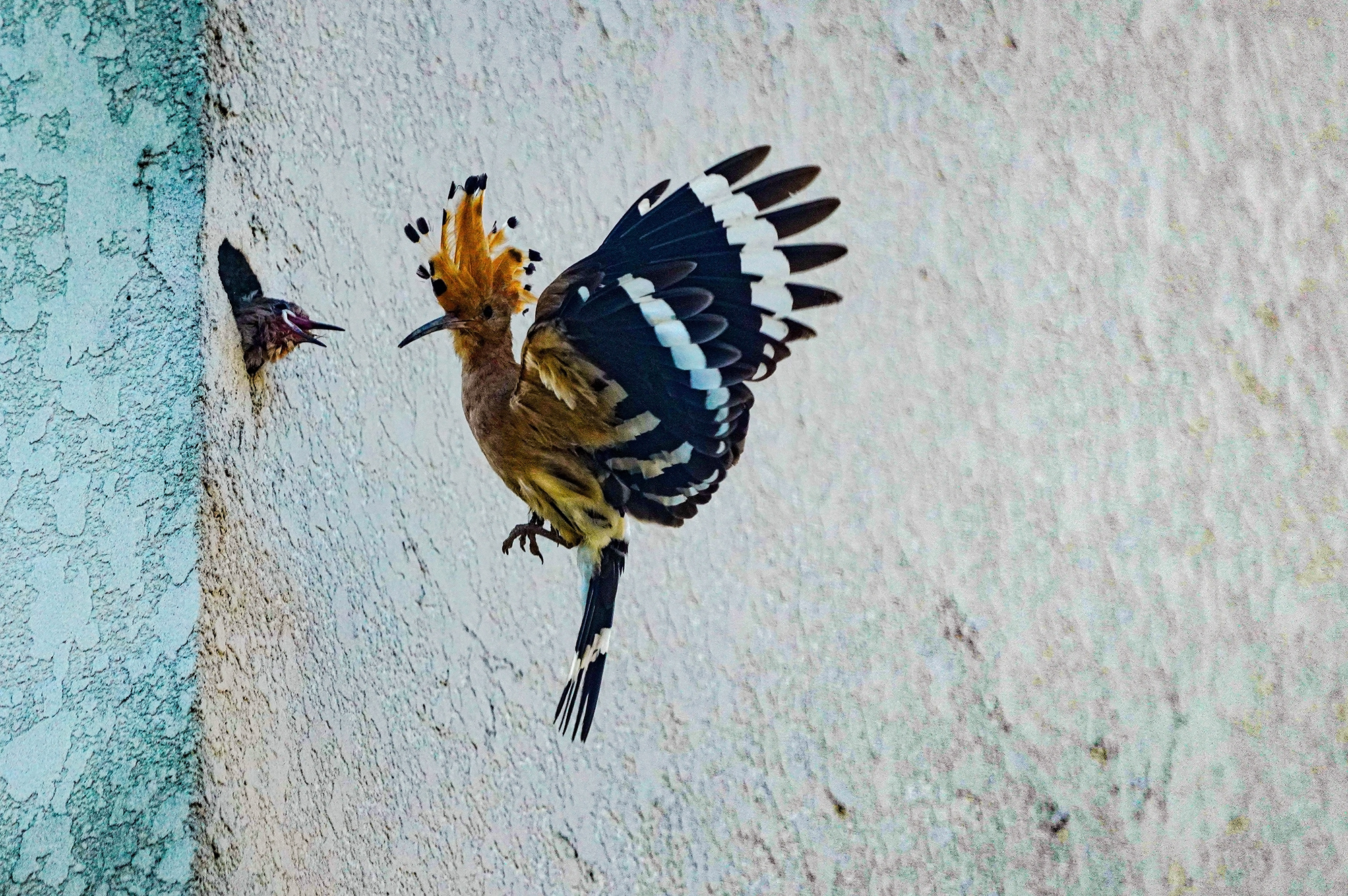 후투티 유조 2마리가 둥지밖으로 몸 절반을 내놓고 어미를 기다리고 있다,