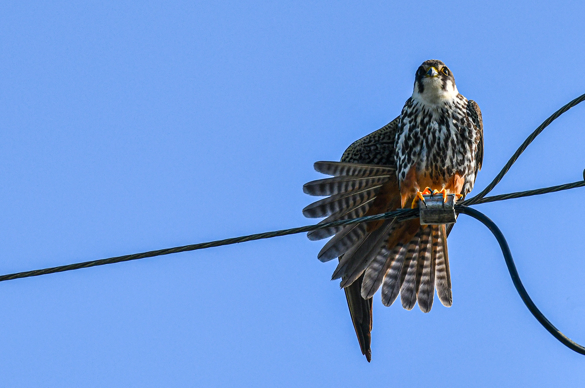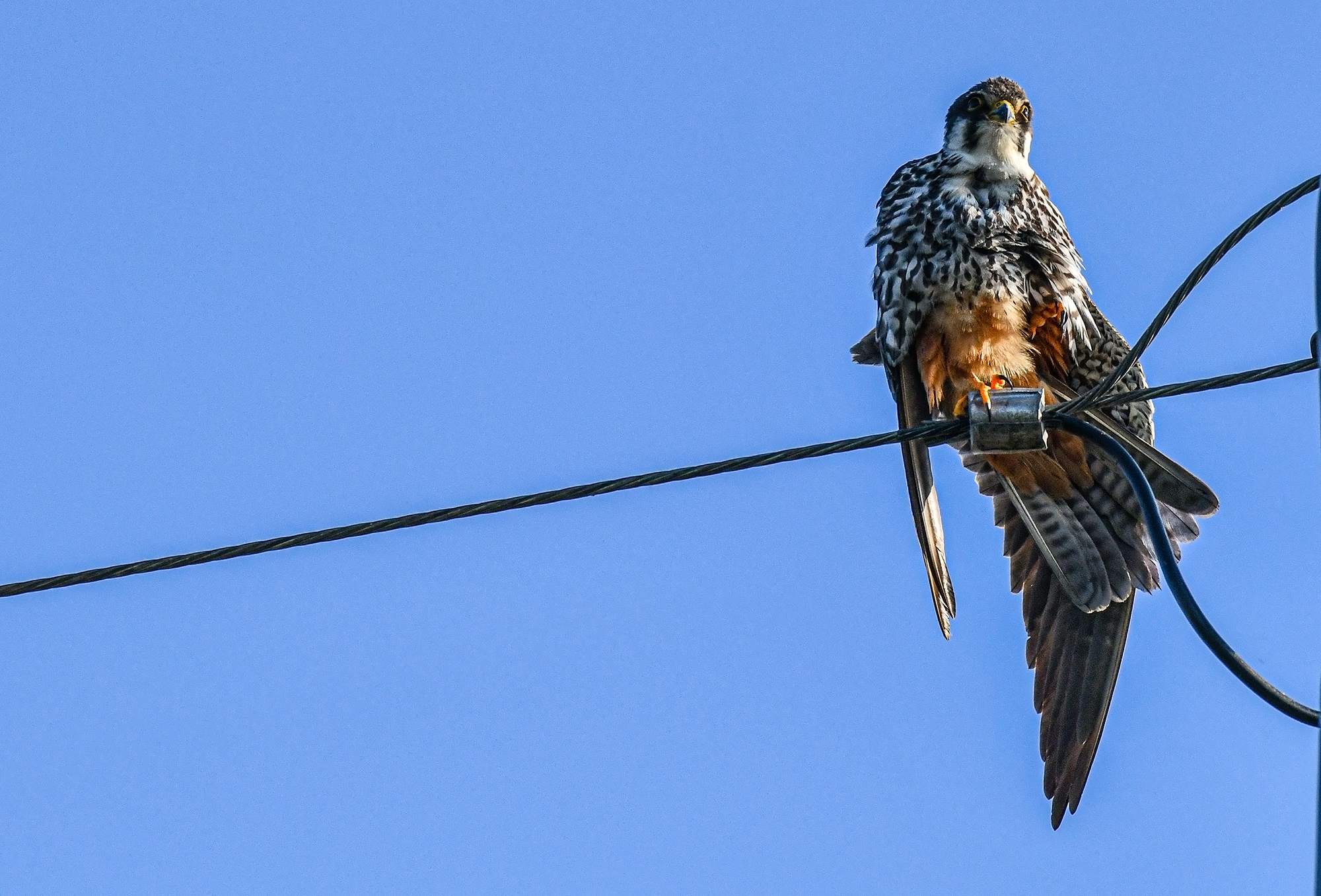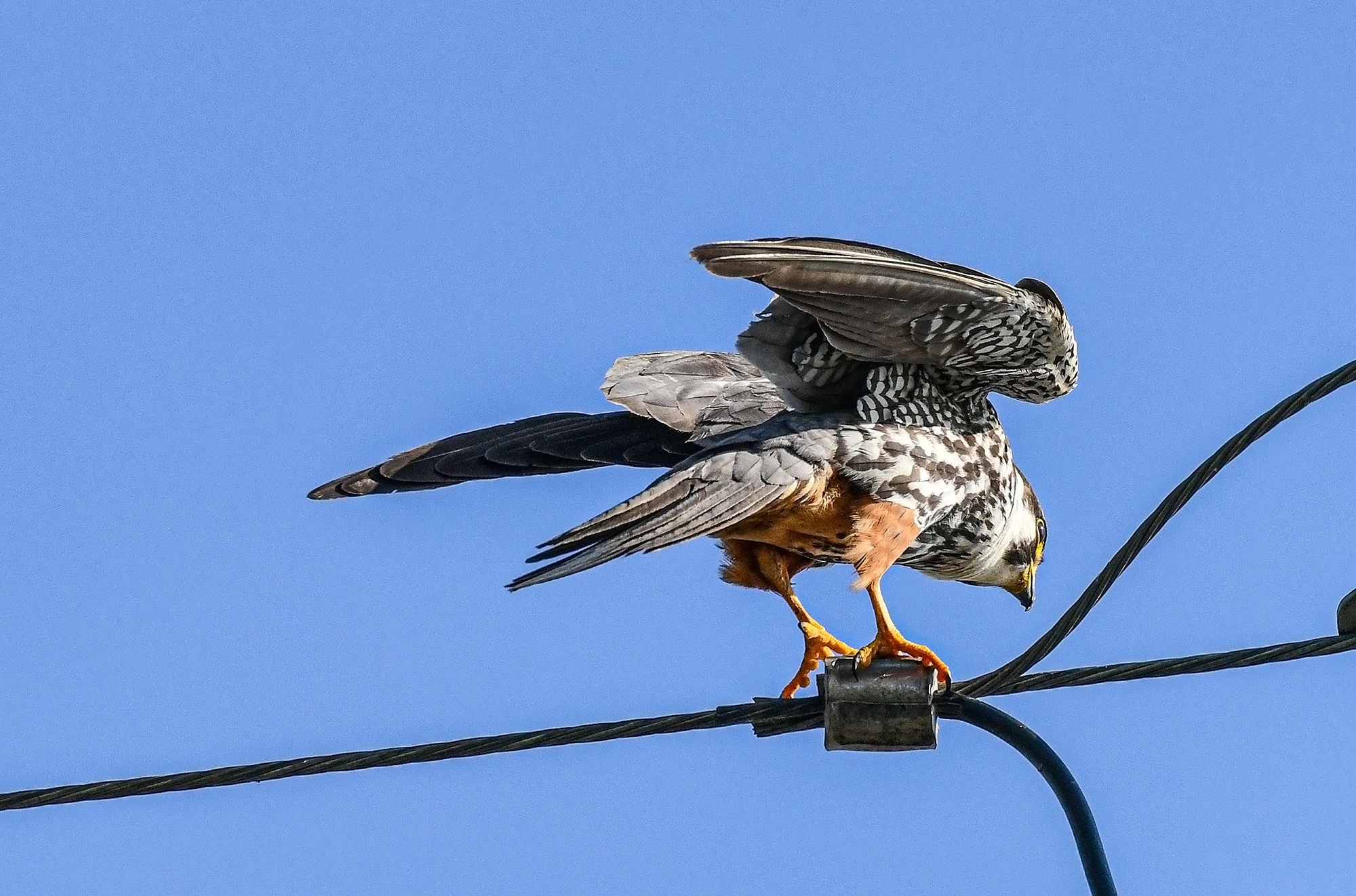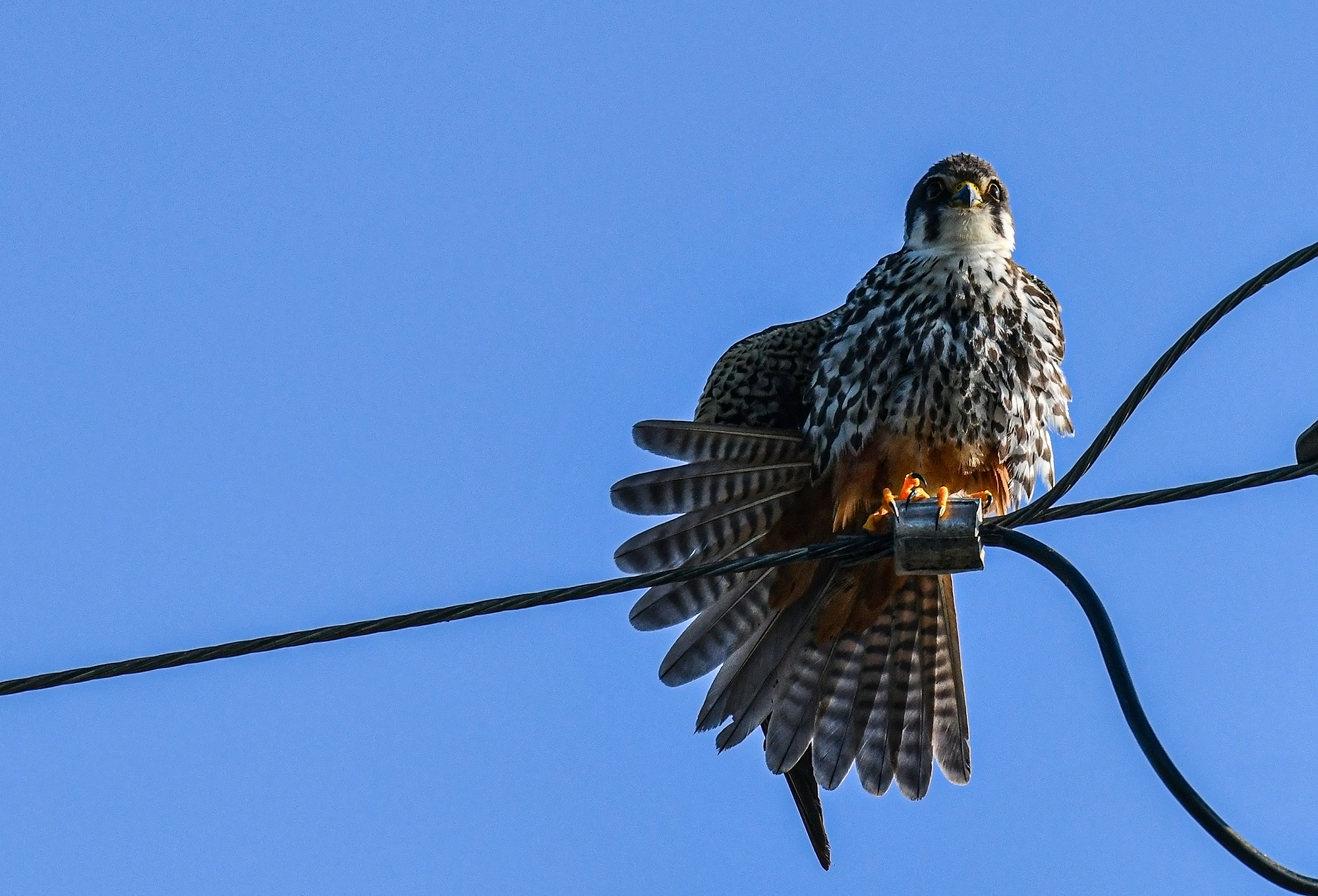 새홀리기가 높은 철탑 통신주 맨 꼭대기 원형 구조물 평평한곳에