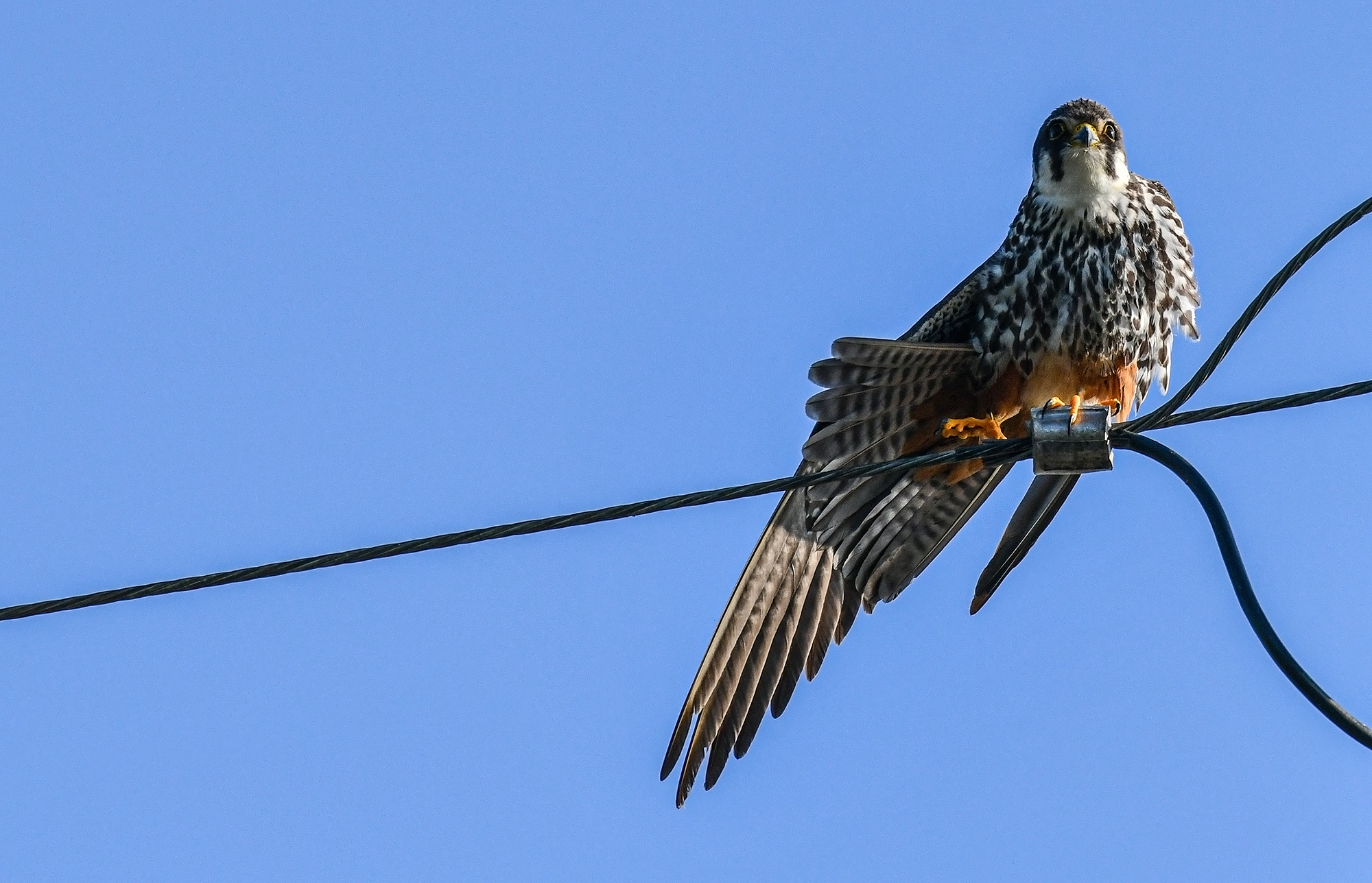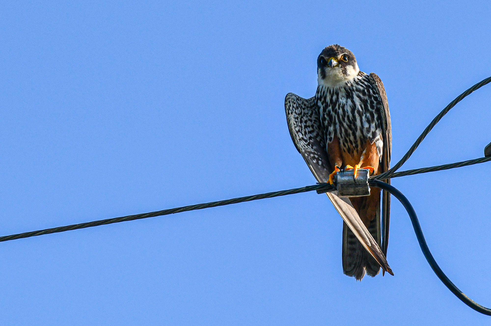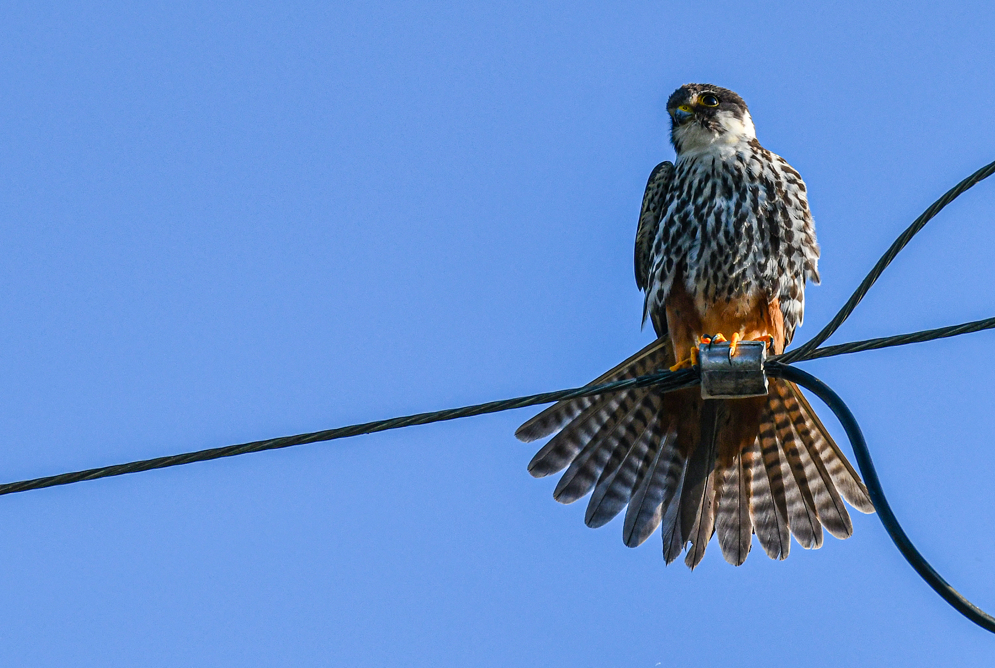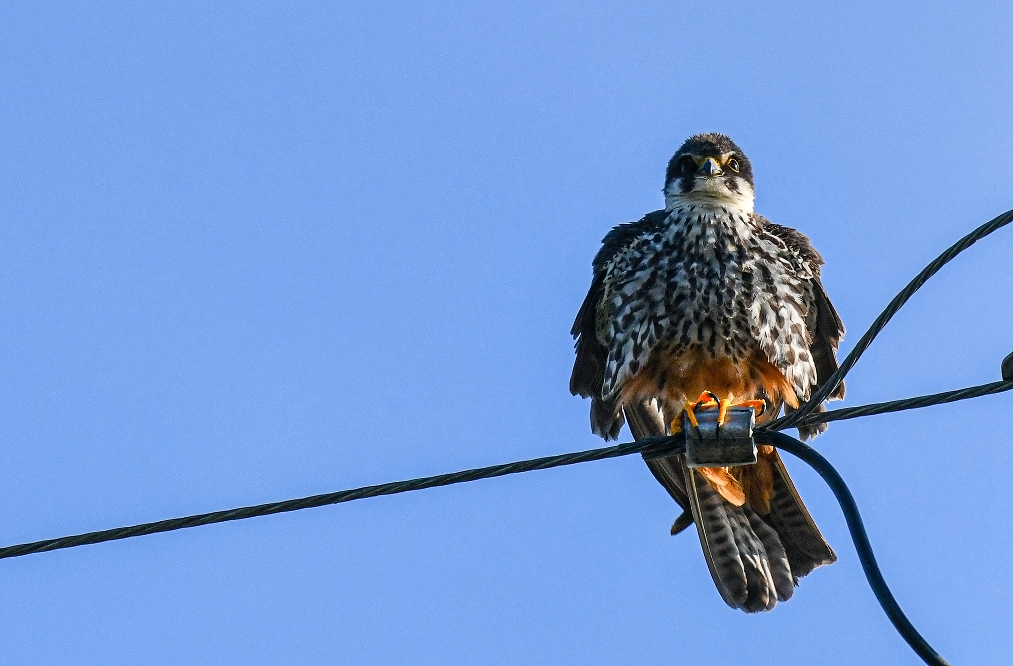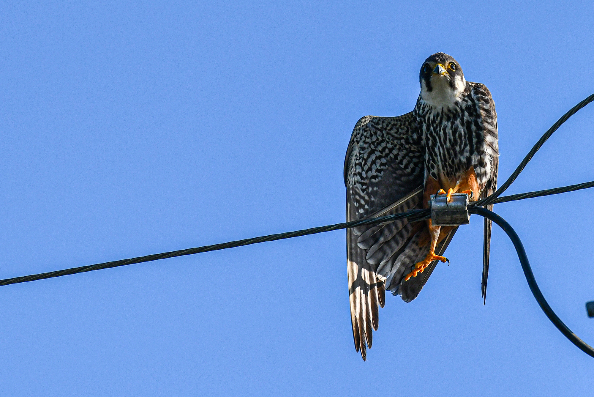 새홀리기가 높은 철탑 통신주 맨 꼭대기 원형 구조물 평평한곳에