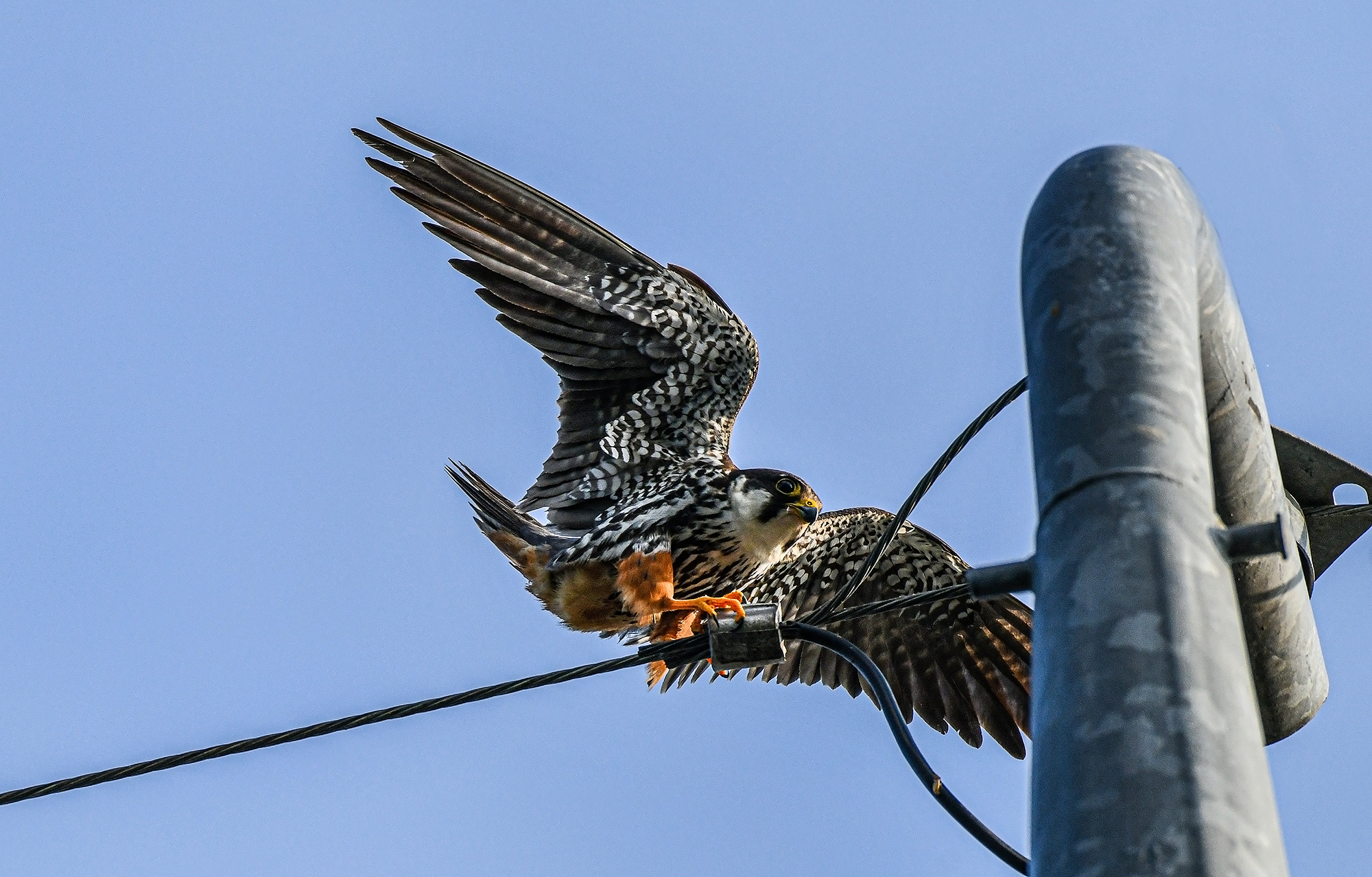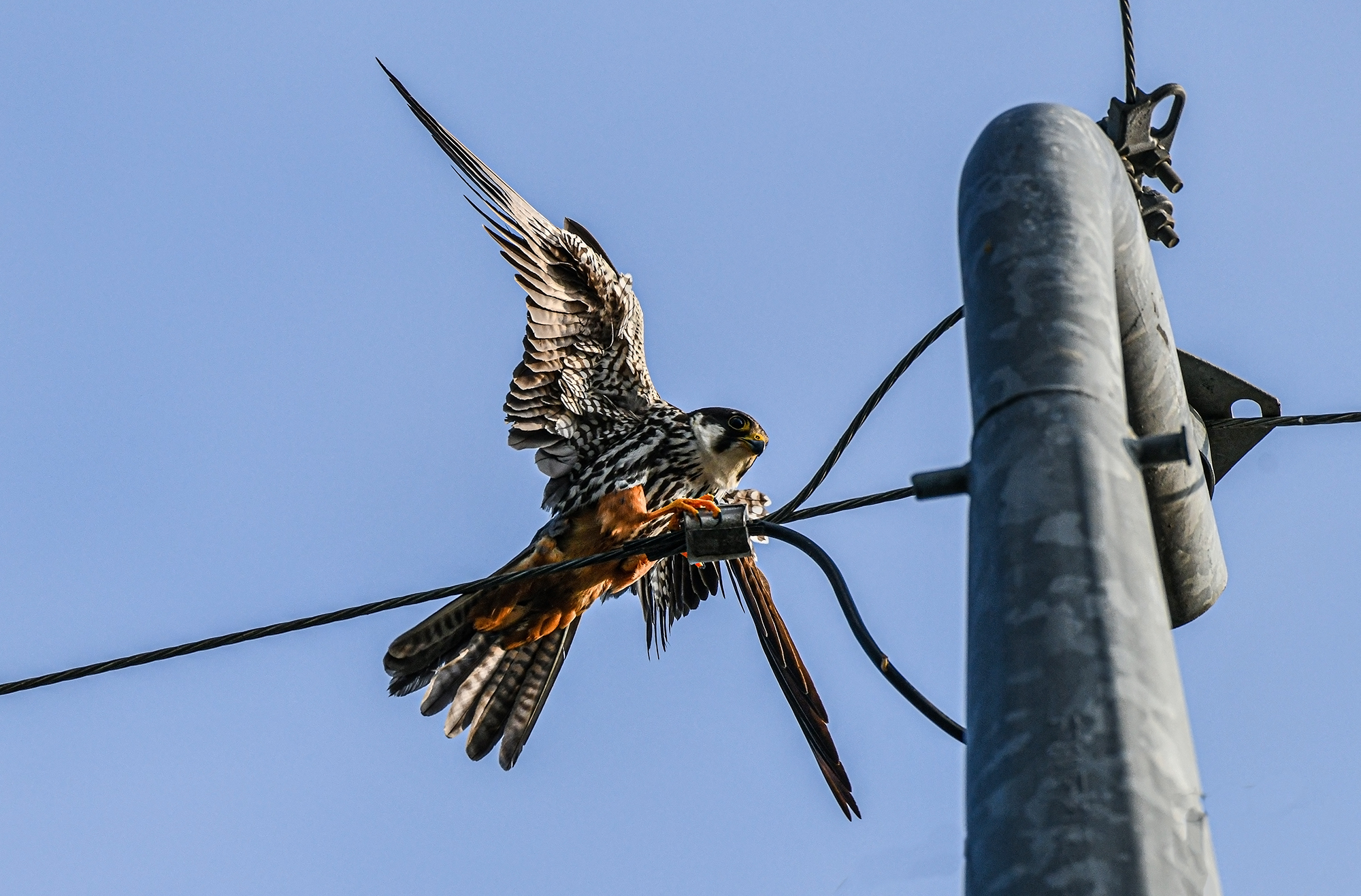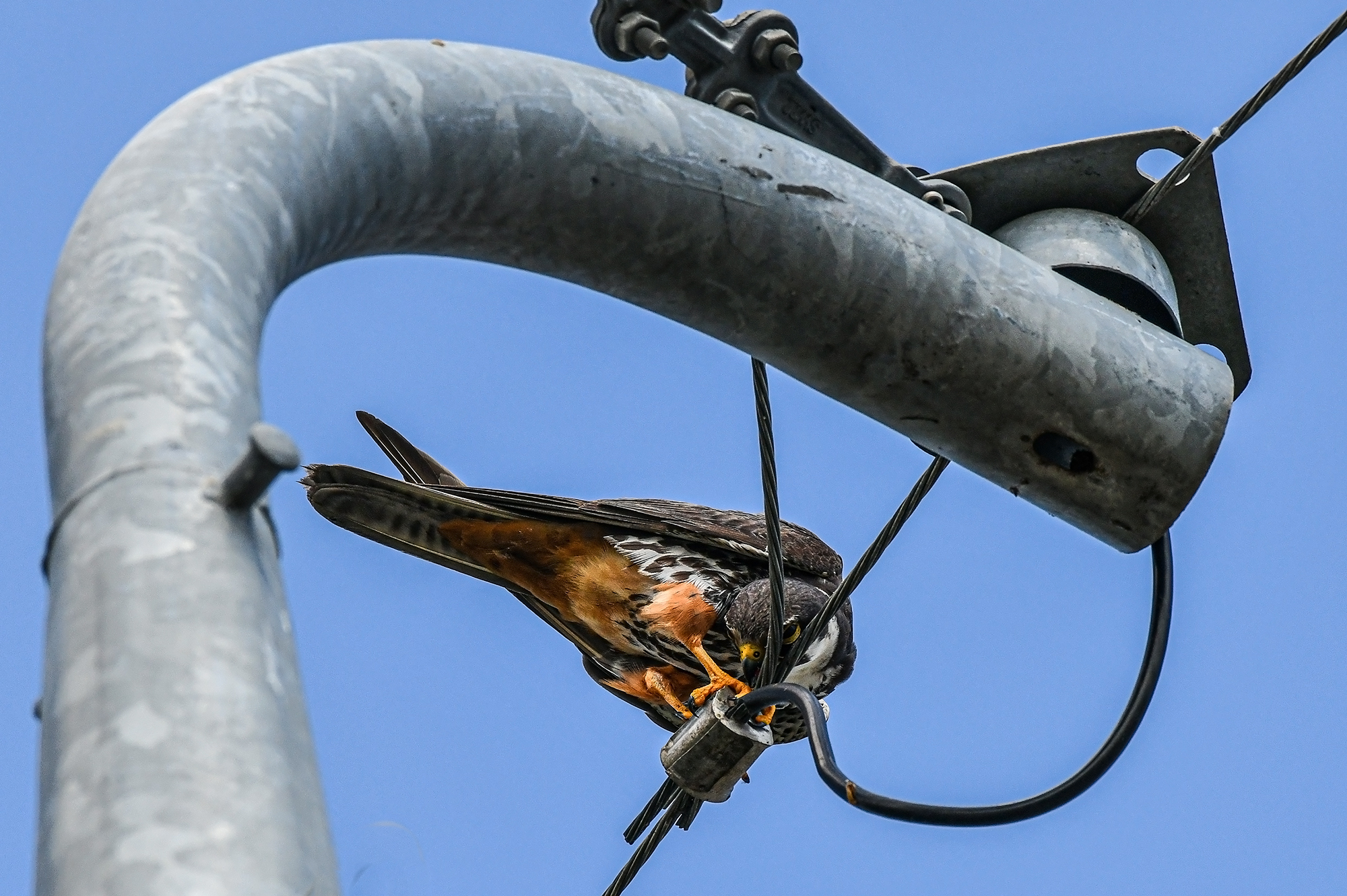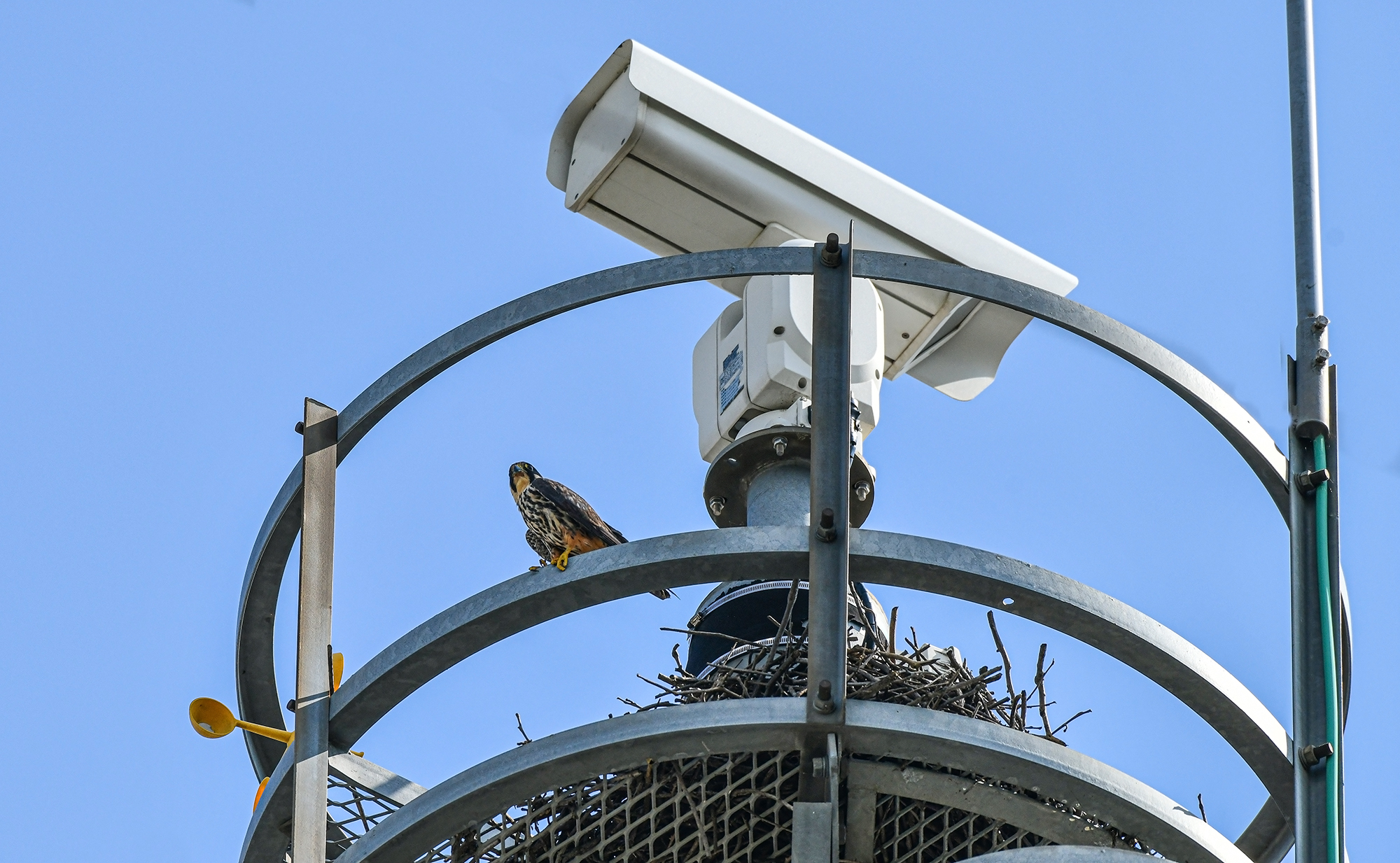 새홀리기가 높은 철탑 통신주 맨 꼭대기 원형 구조물 평평한곳에