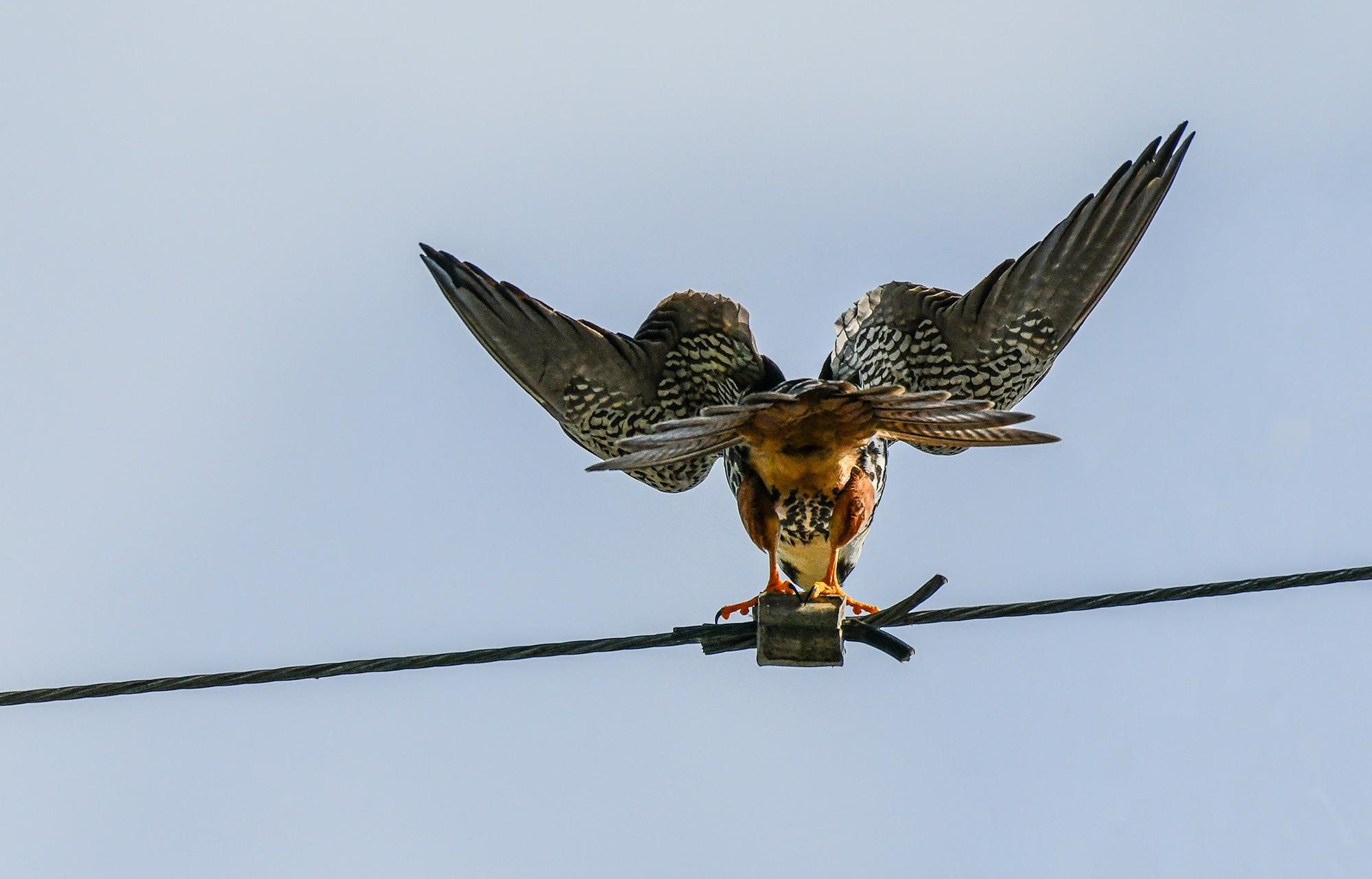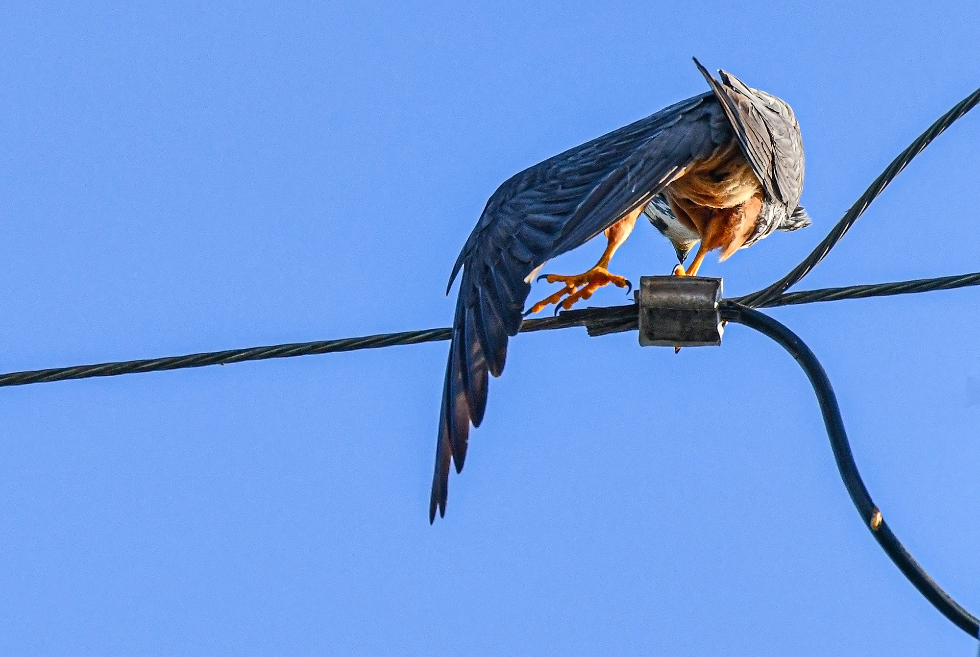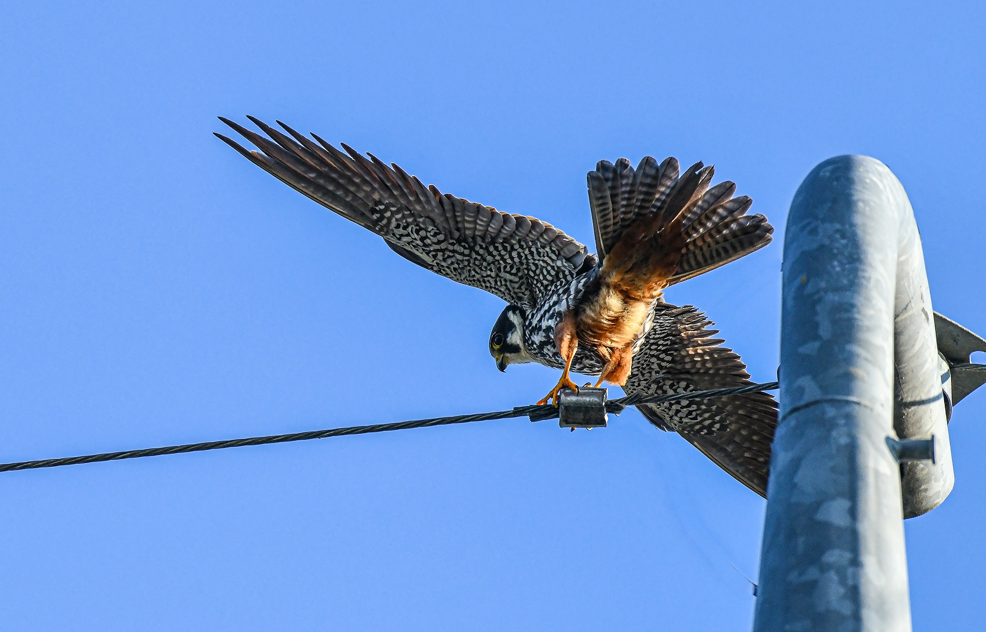 새홀리기가 높은 철탑 통신주 맨 꼭대기 원형 구조물 평평한곳에