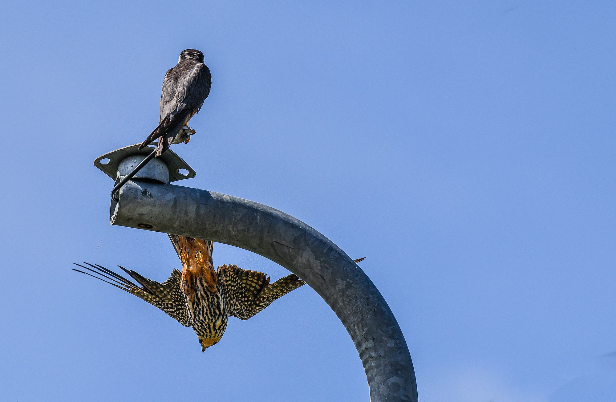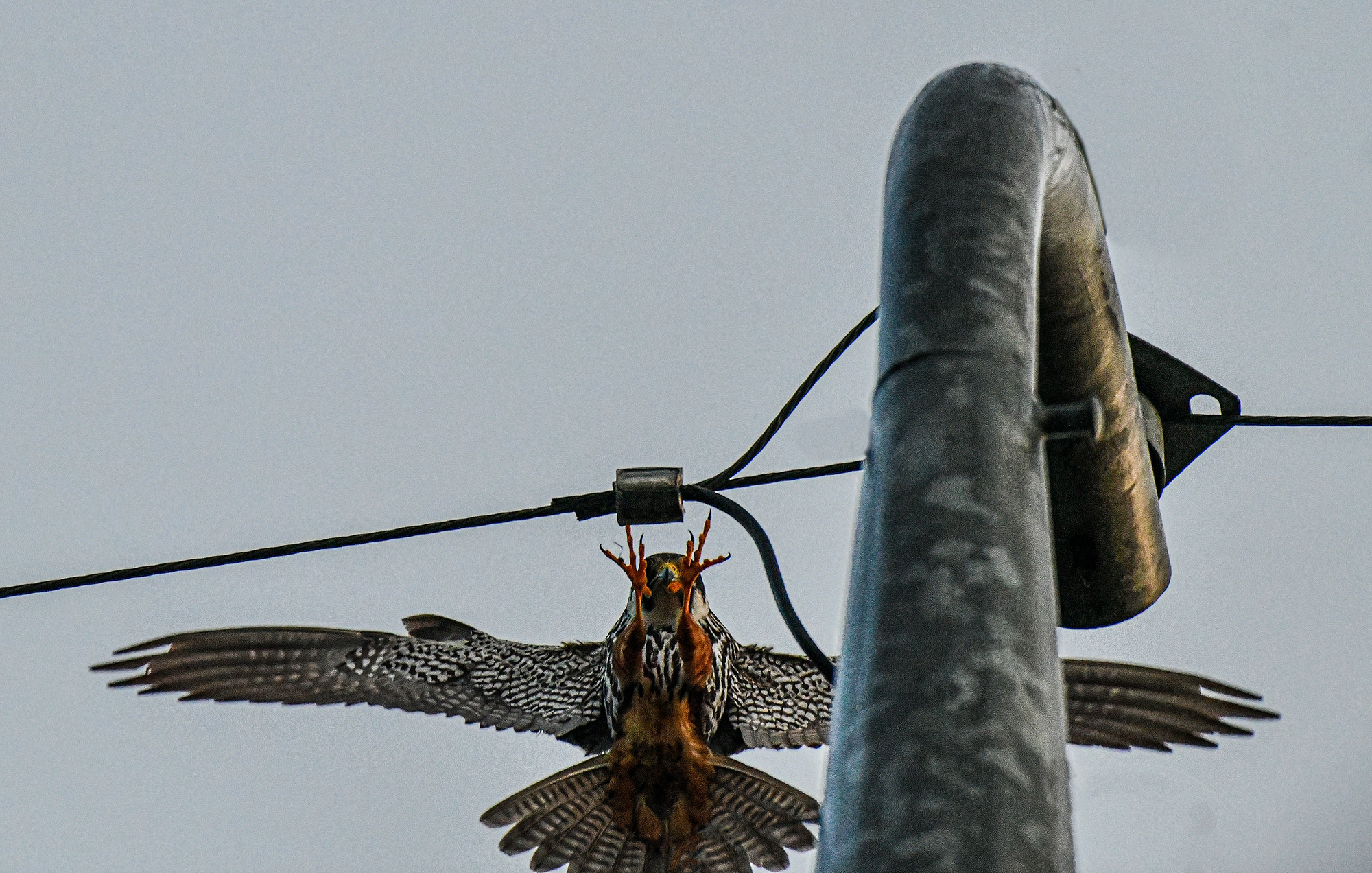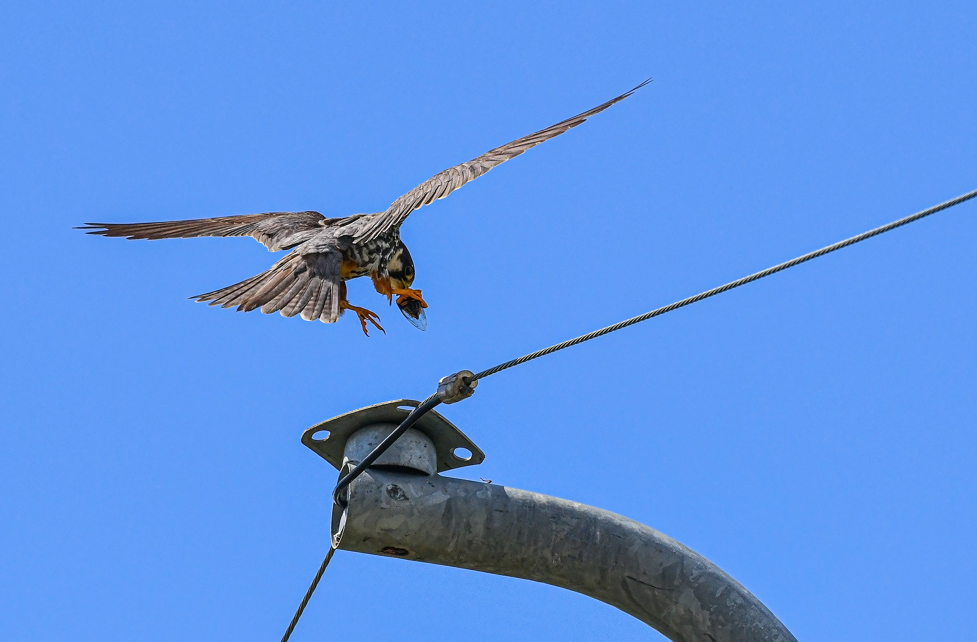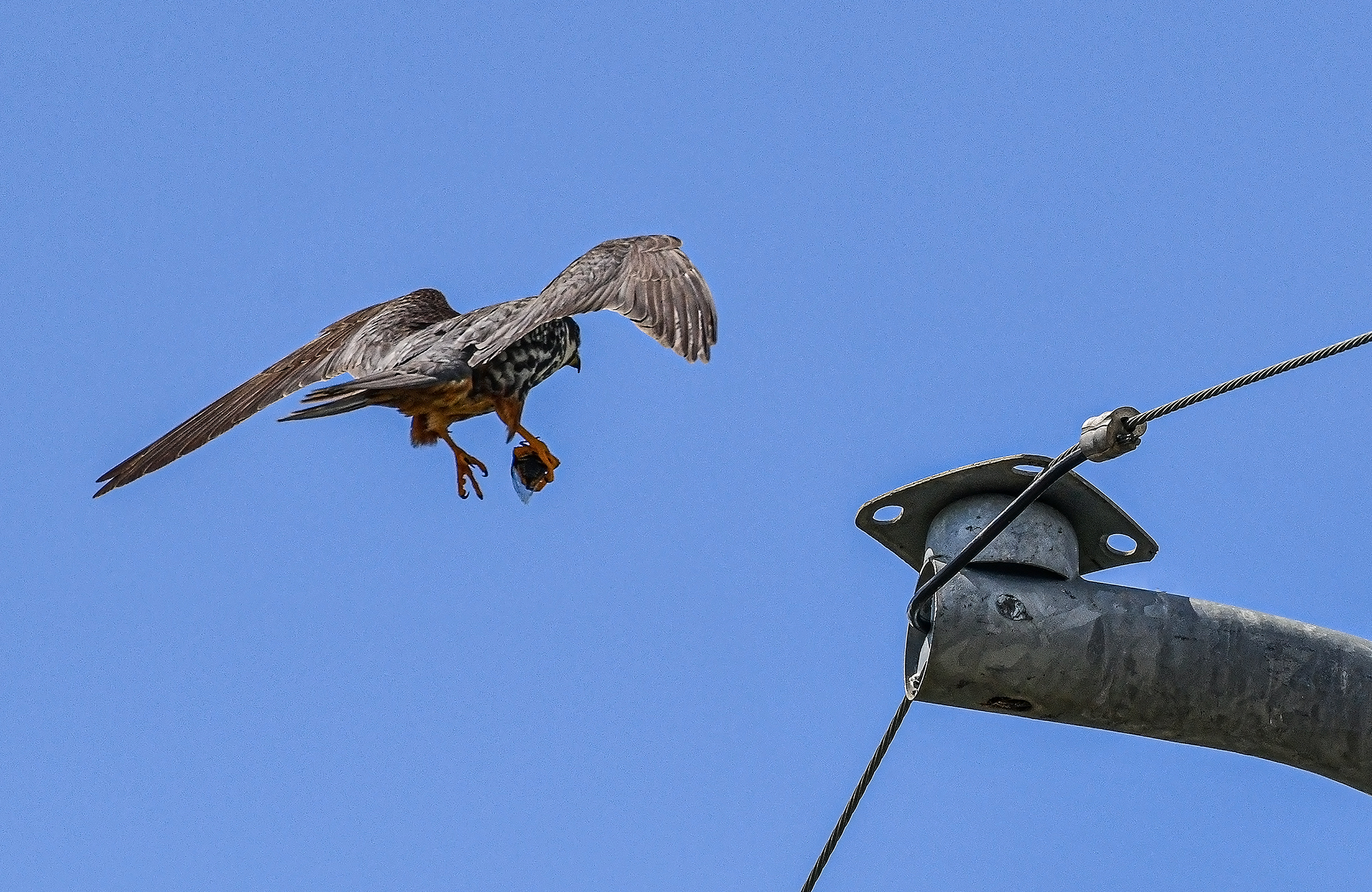 새홀리기가 매미를 사냥해 발톱으로 웅켜쥐고 철주에 내리고 있다,