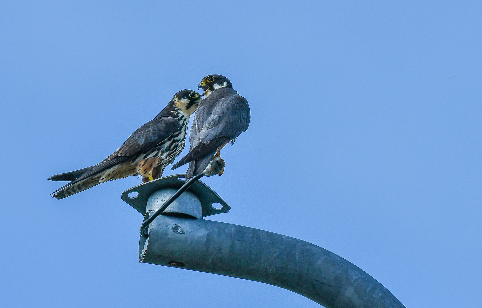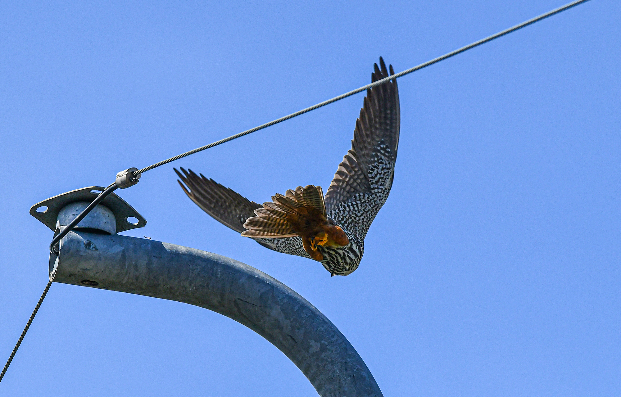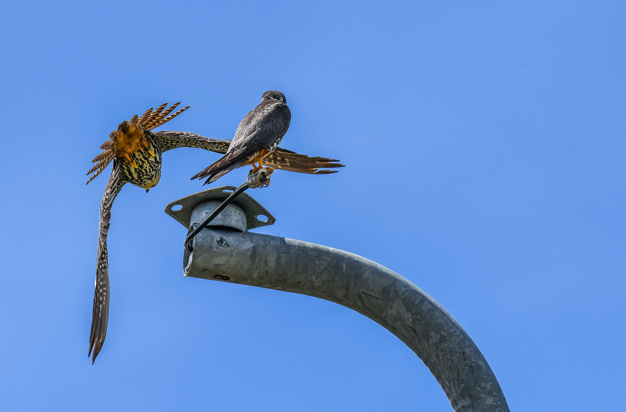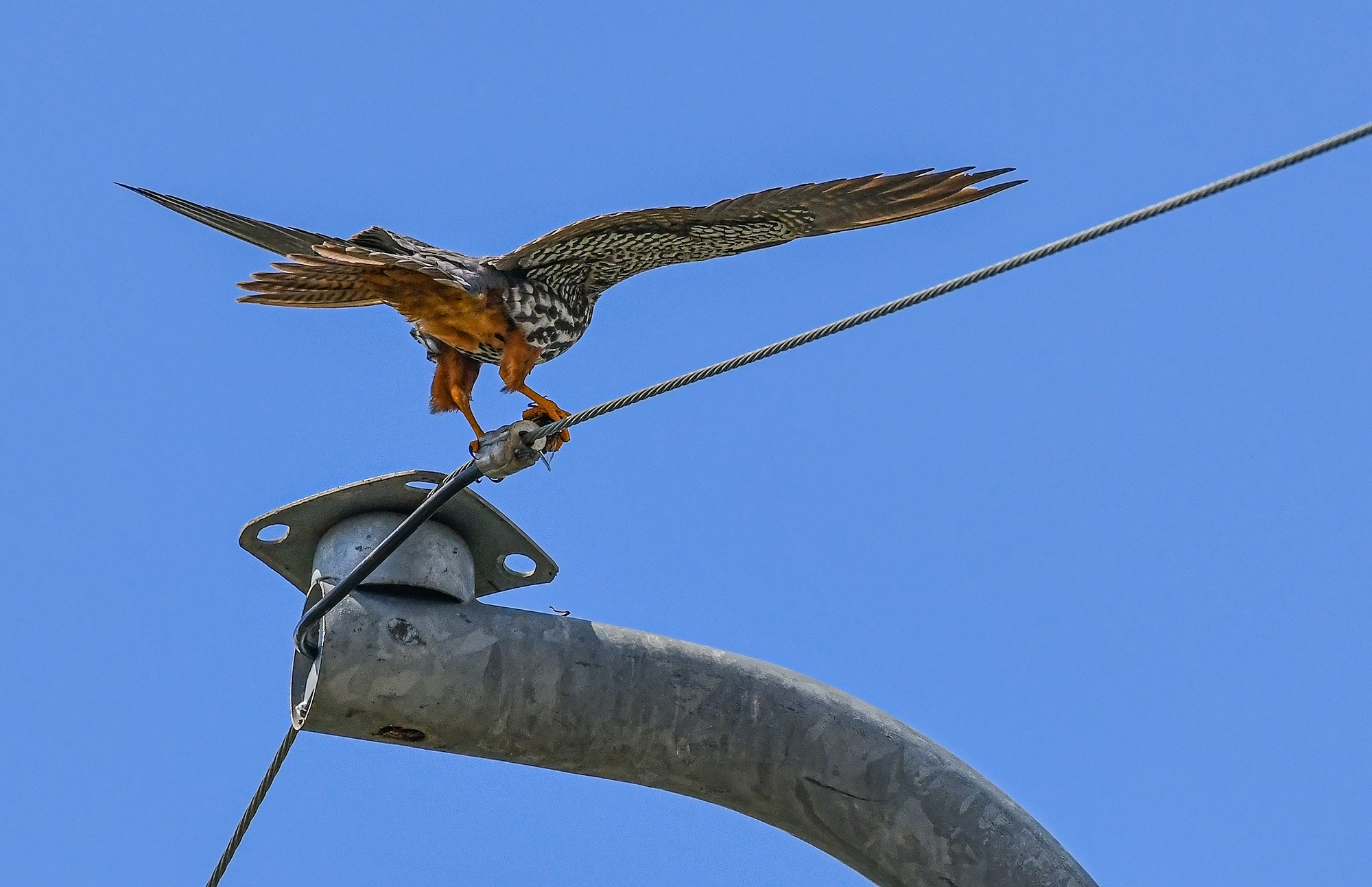 새홀리기가 매미를 사냥해 발톱으로 웅켜쥐고 철주에 내리고 있다,