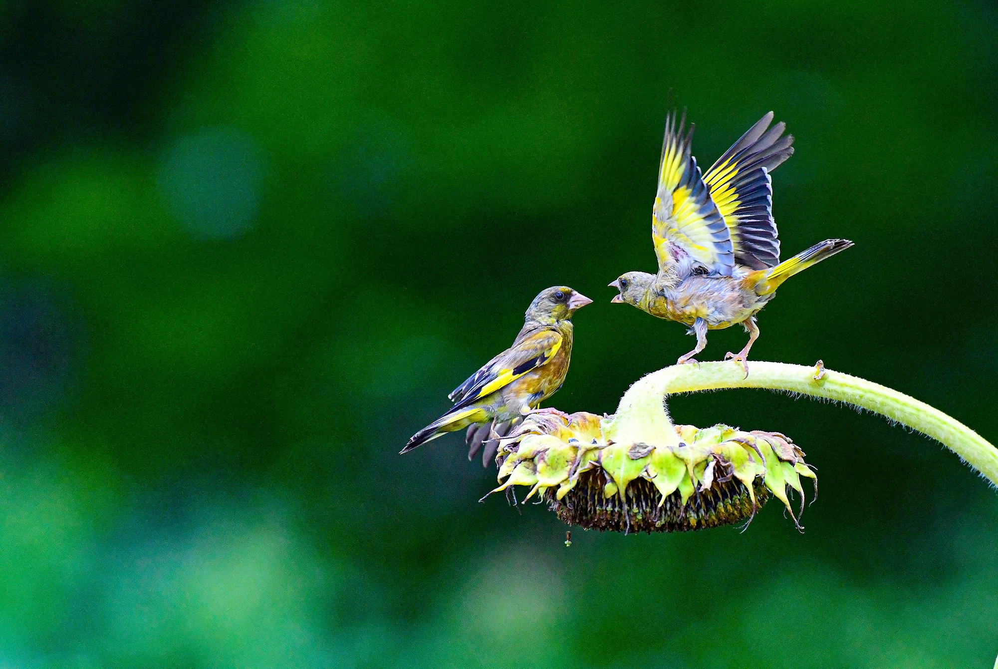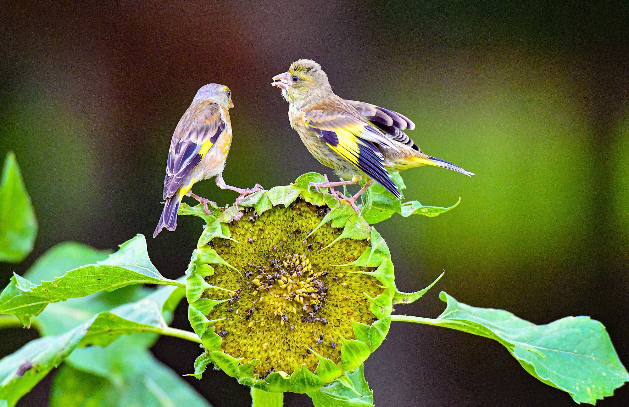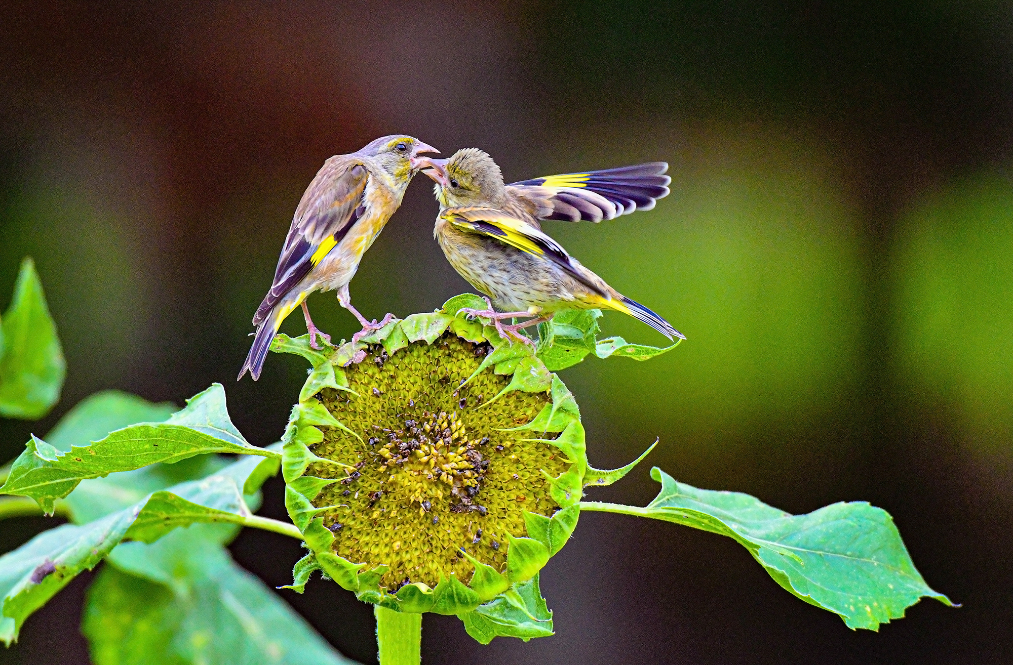 수도권의 한 농장 해바라기 밭에서 방울새가 여문 해바라기 씨앗를