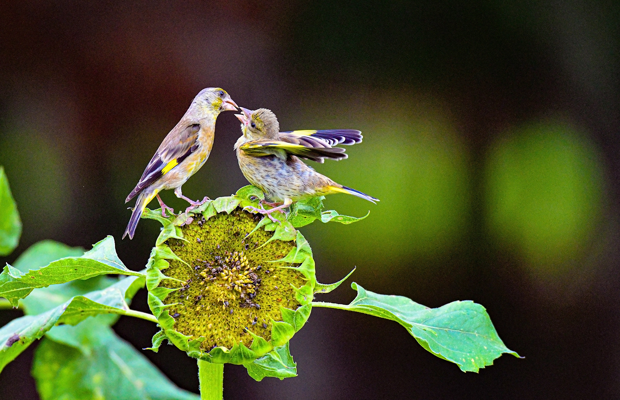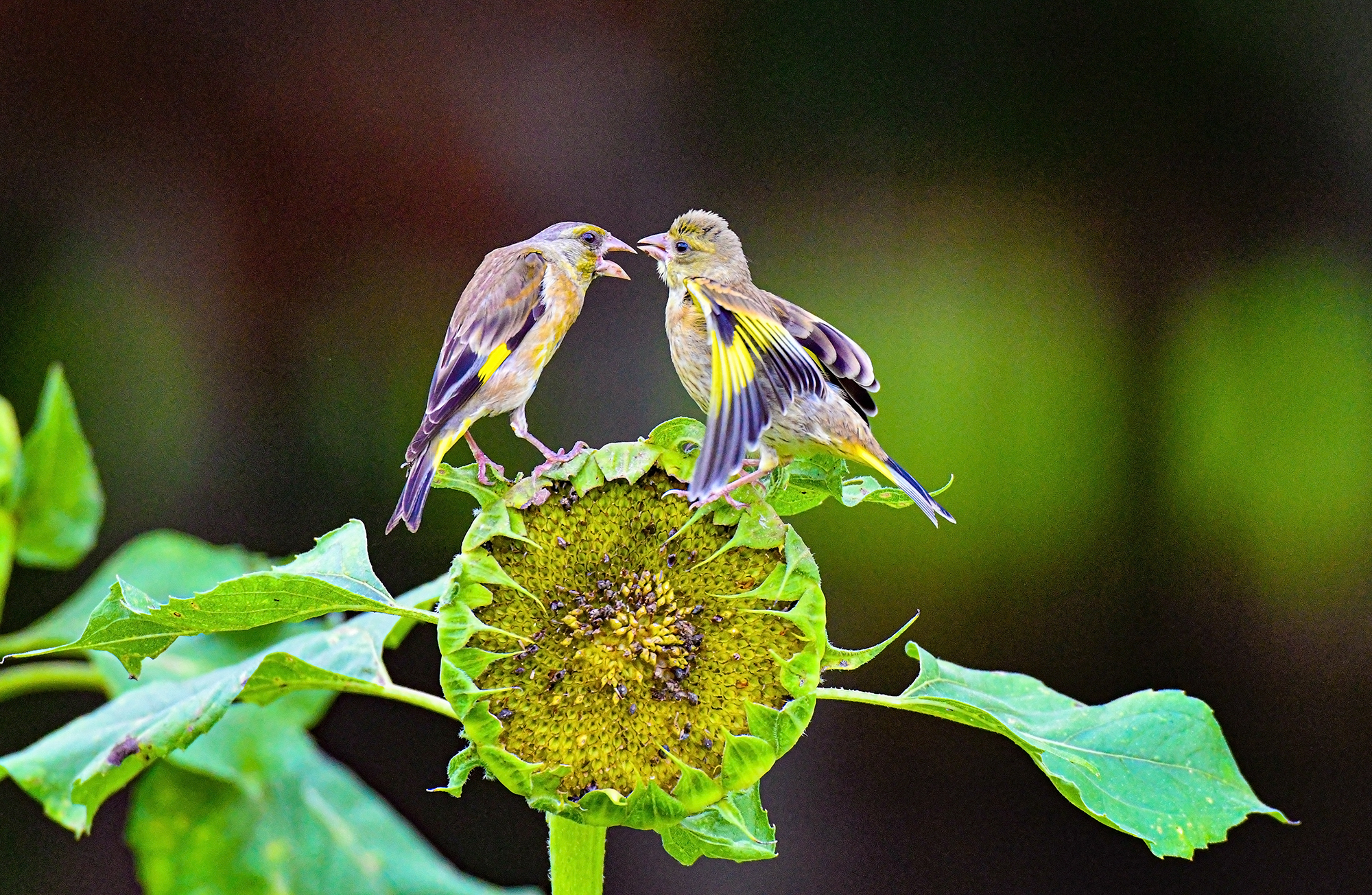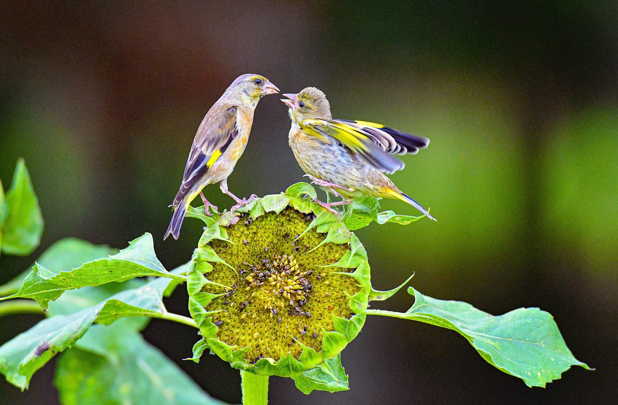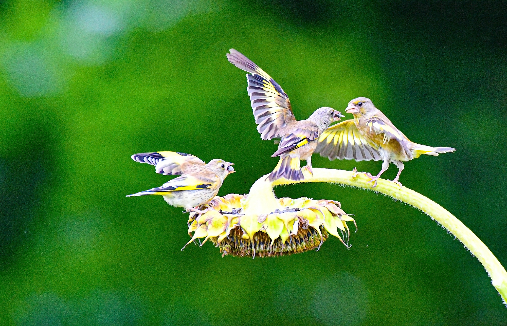 수도권의 한 농장 해바라기 밭에서 방울새가 여문 해바라기 씨앗를