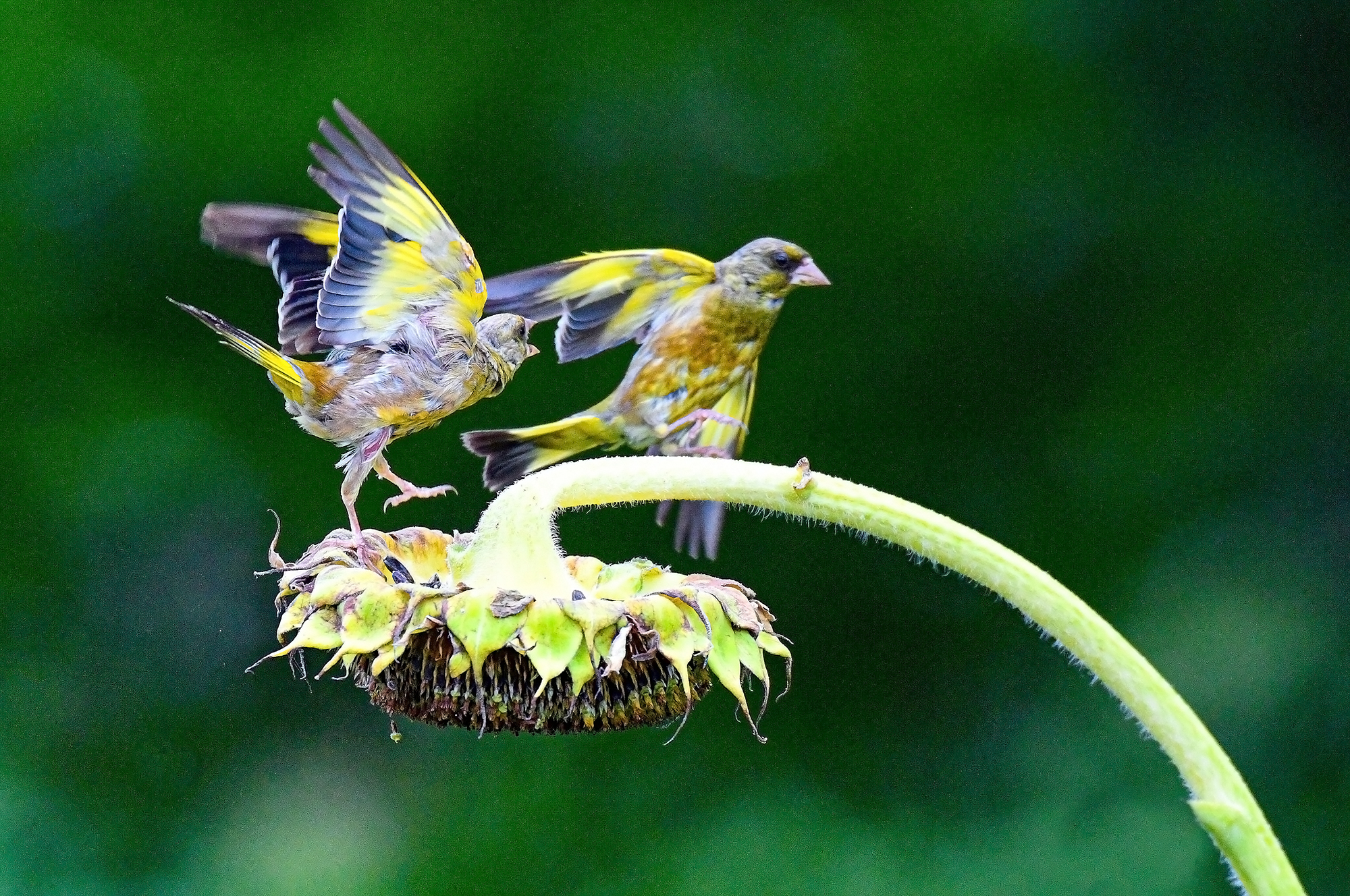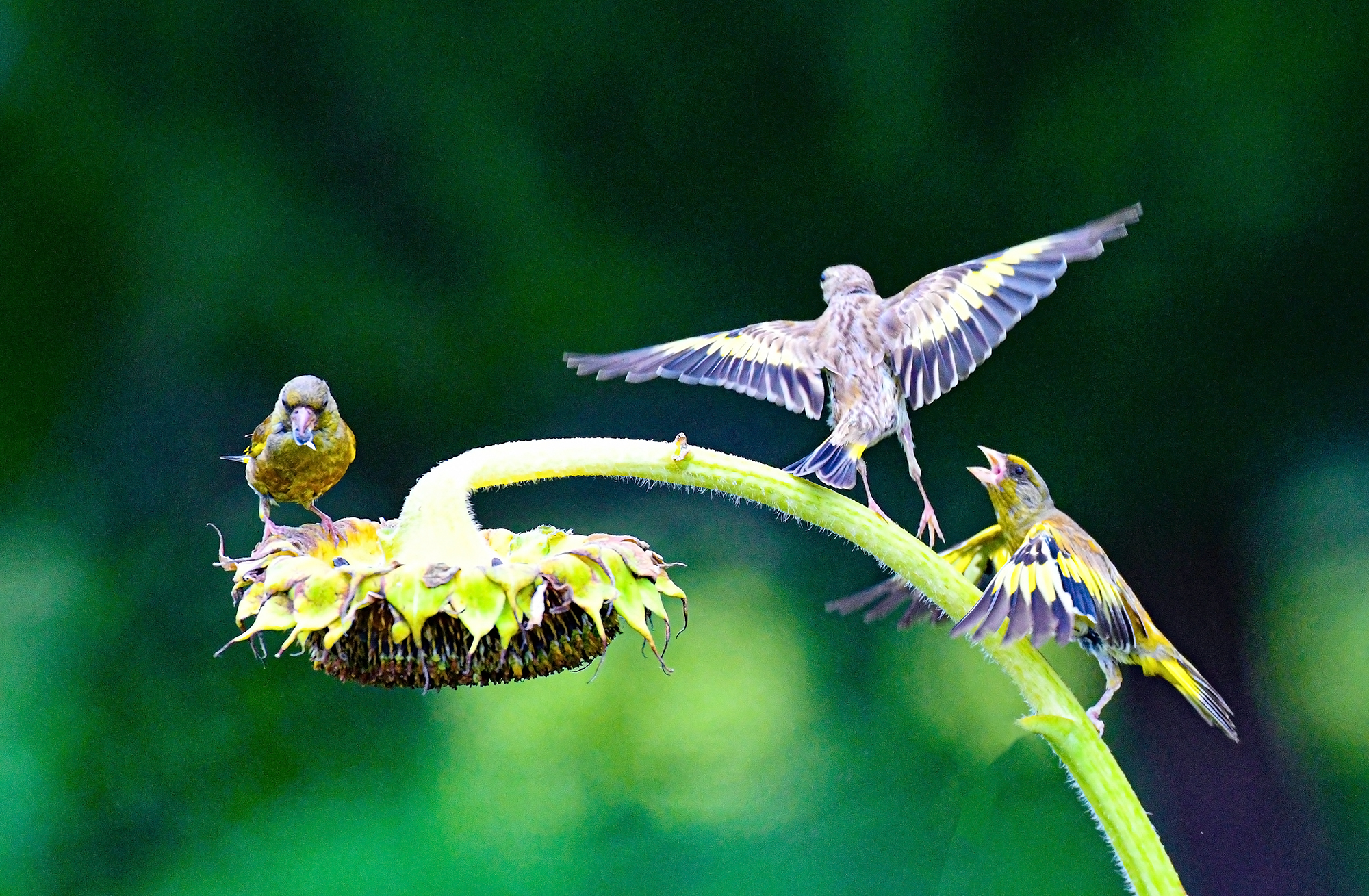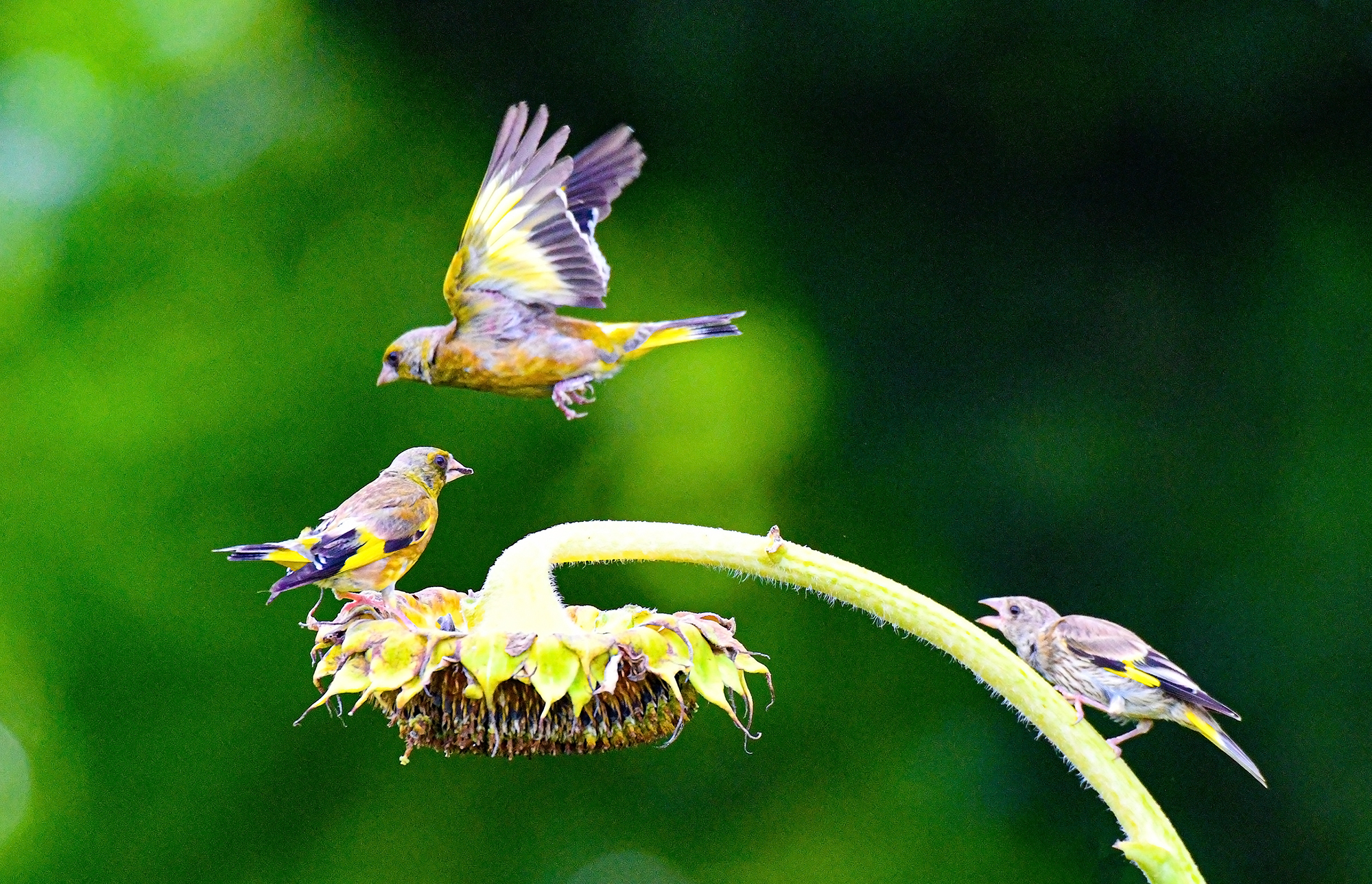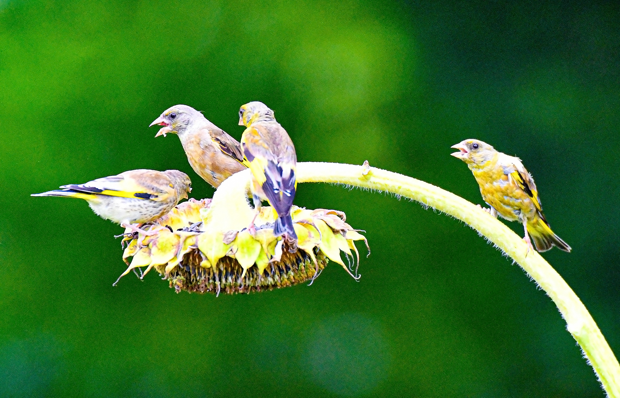 수도권의 한 농장 해바라기 밭에서 방울새가 여문 해바라기 씨앗를