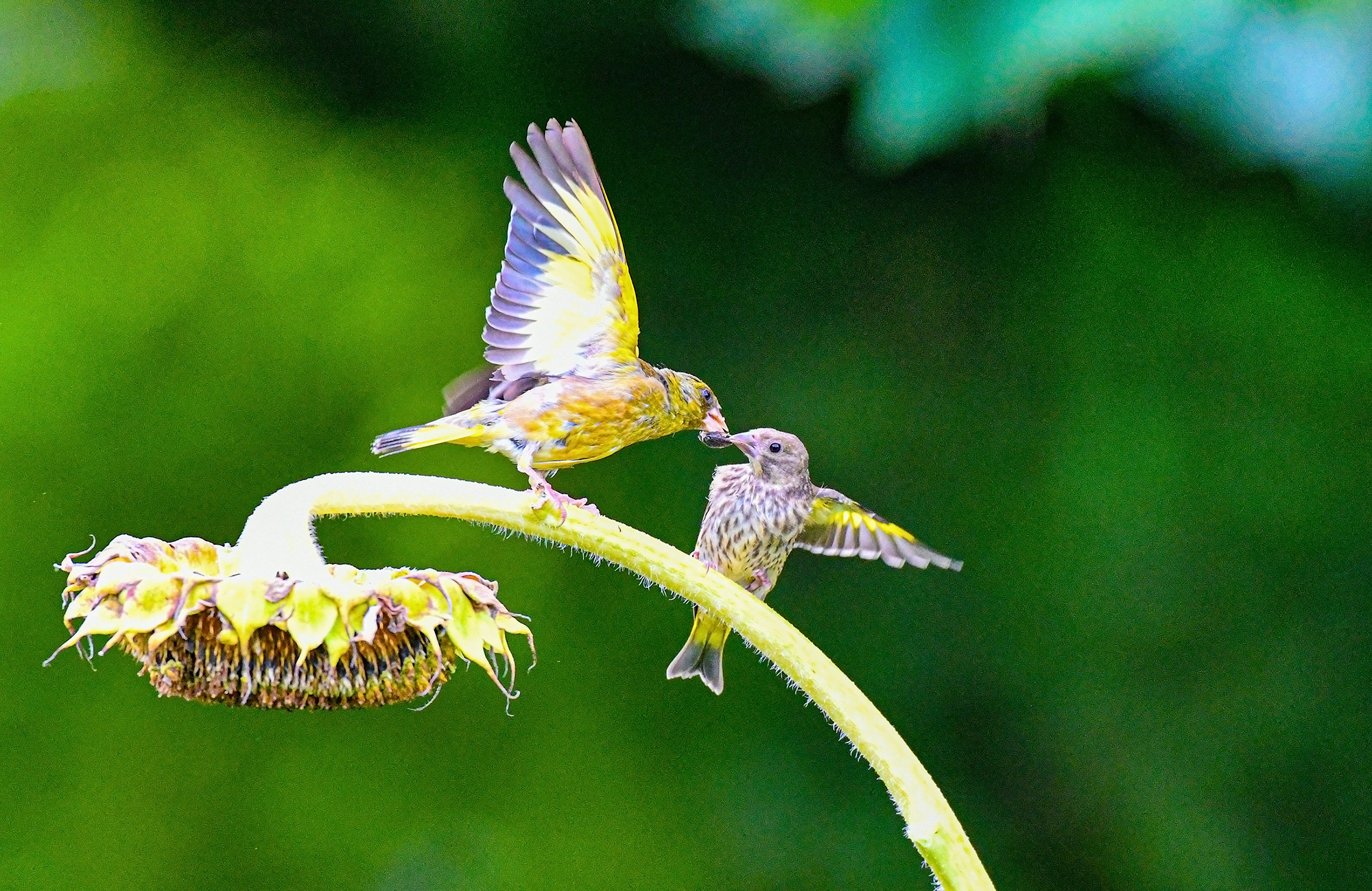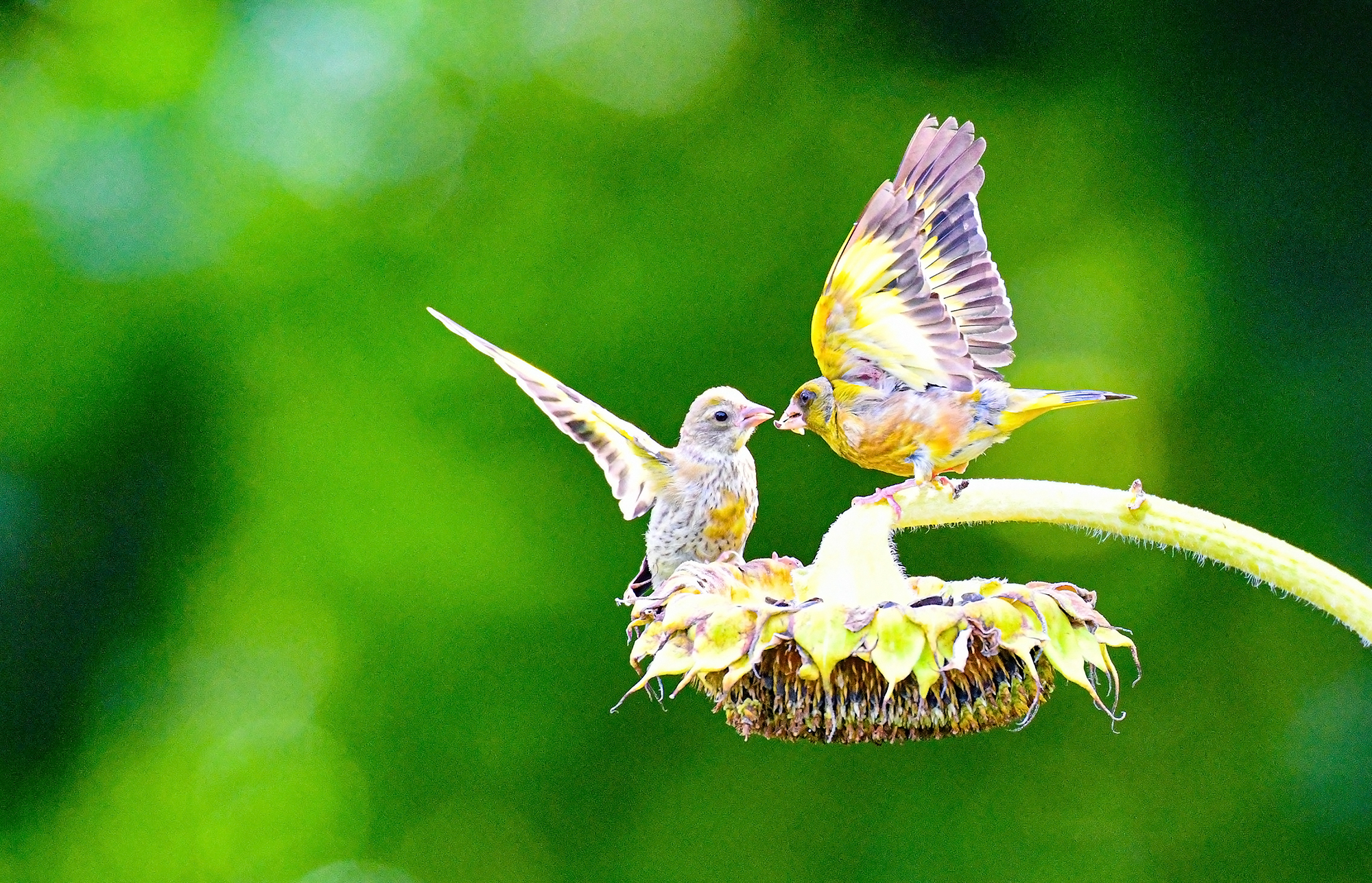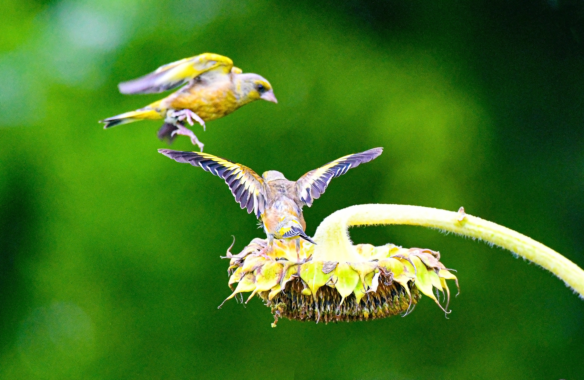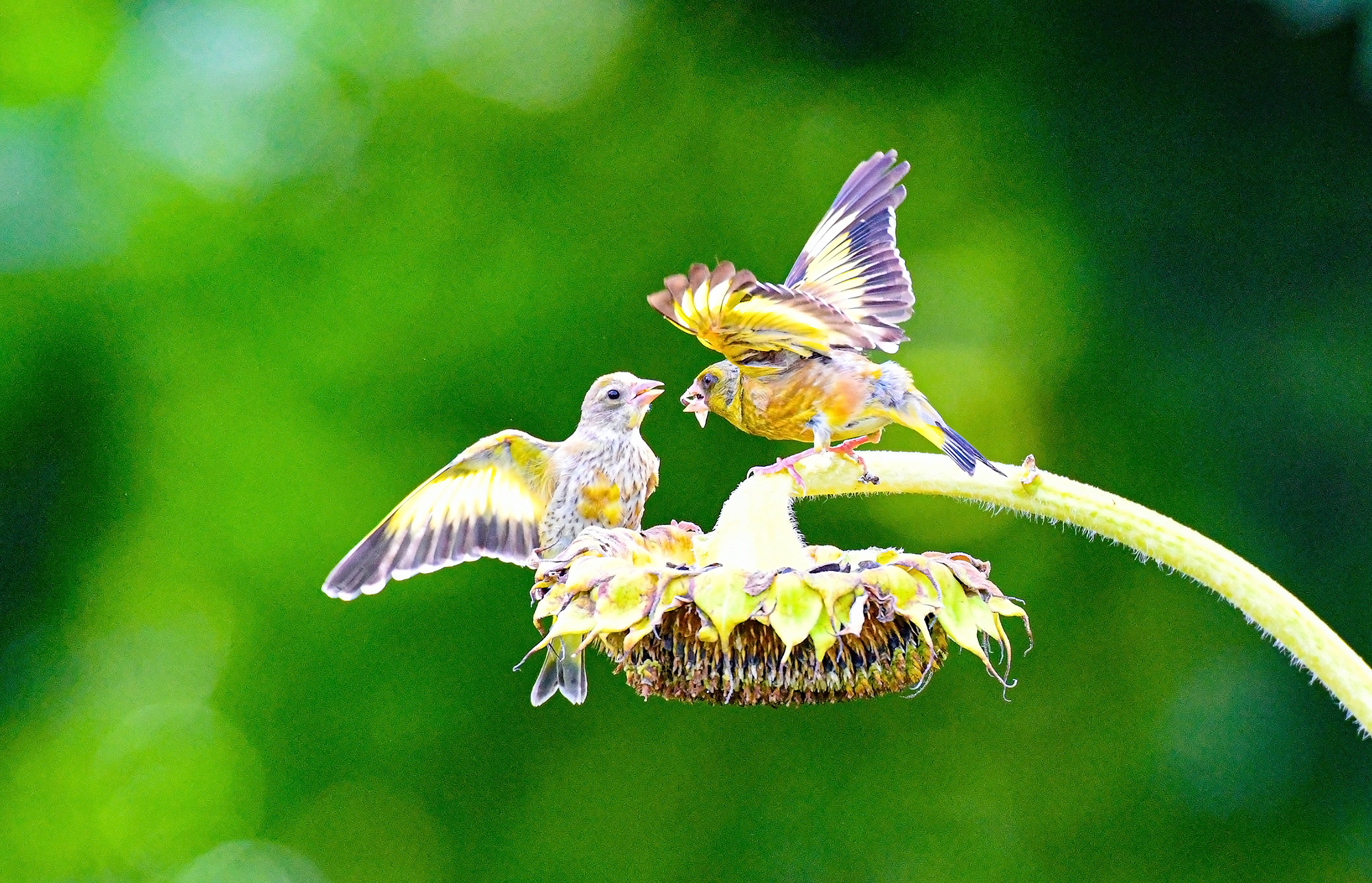 수도권의 한 농장 해바라기 밭에서 방울새가 여문 해바라기 씨앗를