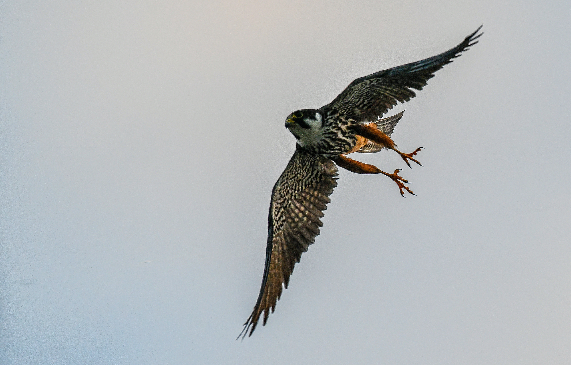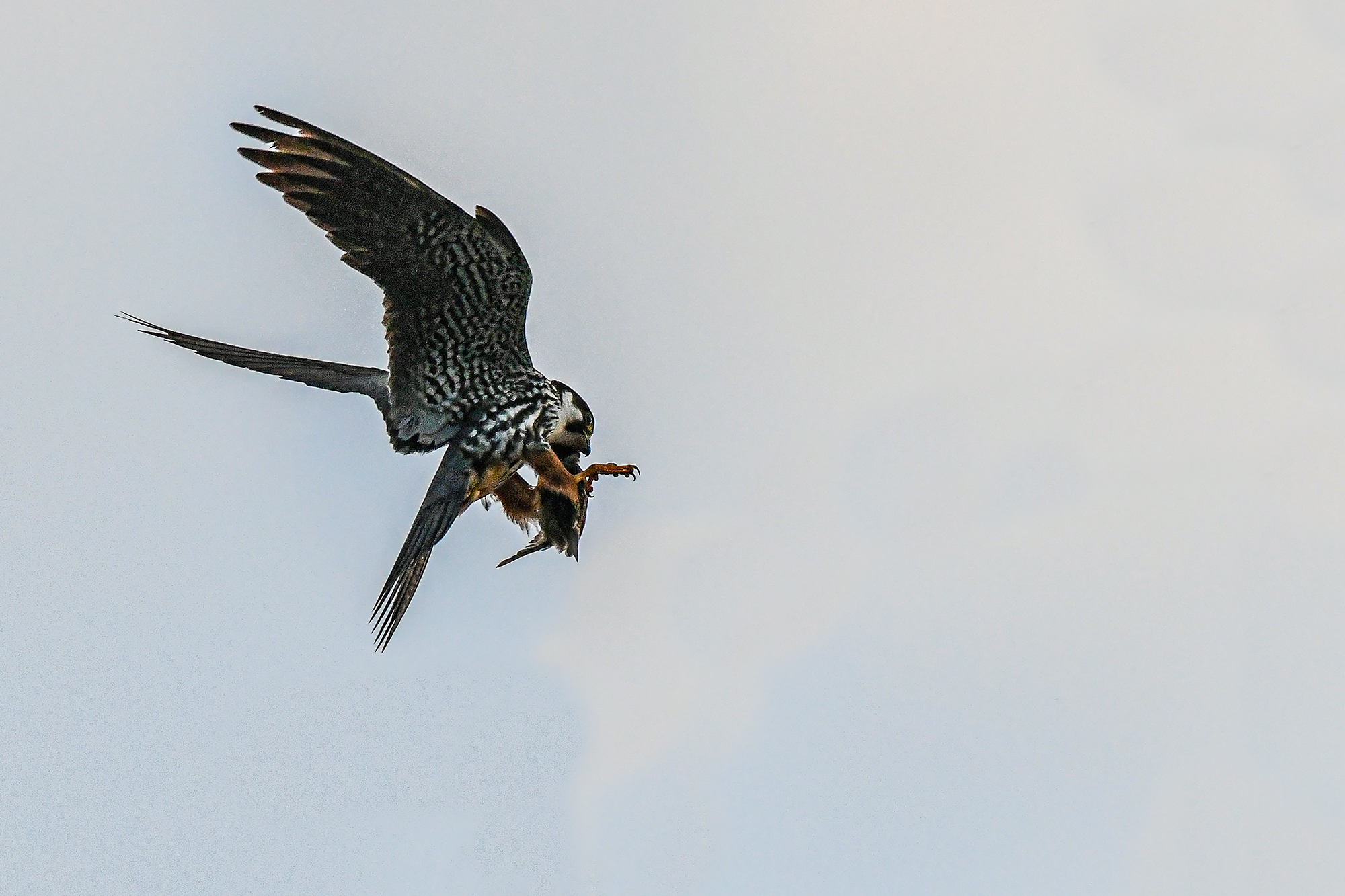 어미새가 새를 사냥해 발톱으로 웅켜쥐고 유조가 있는 둥지로 날아들고있다,