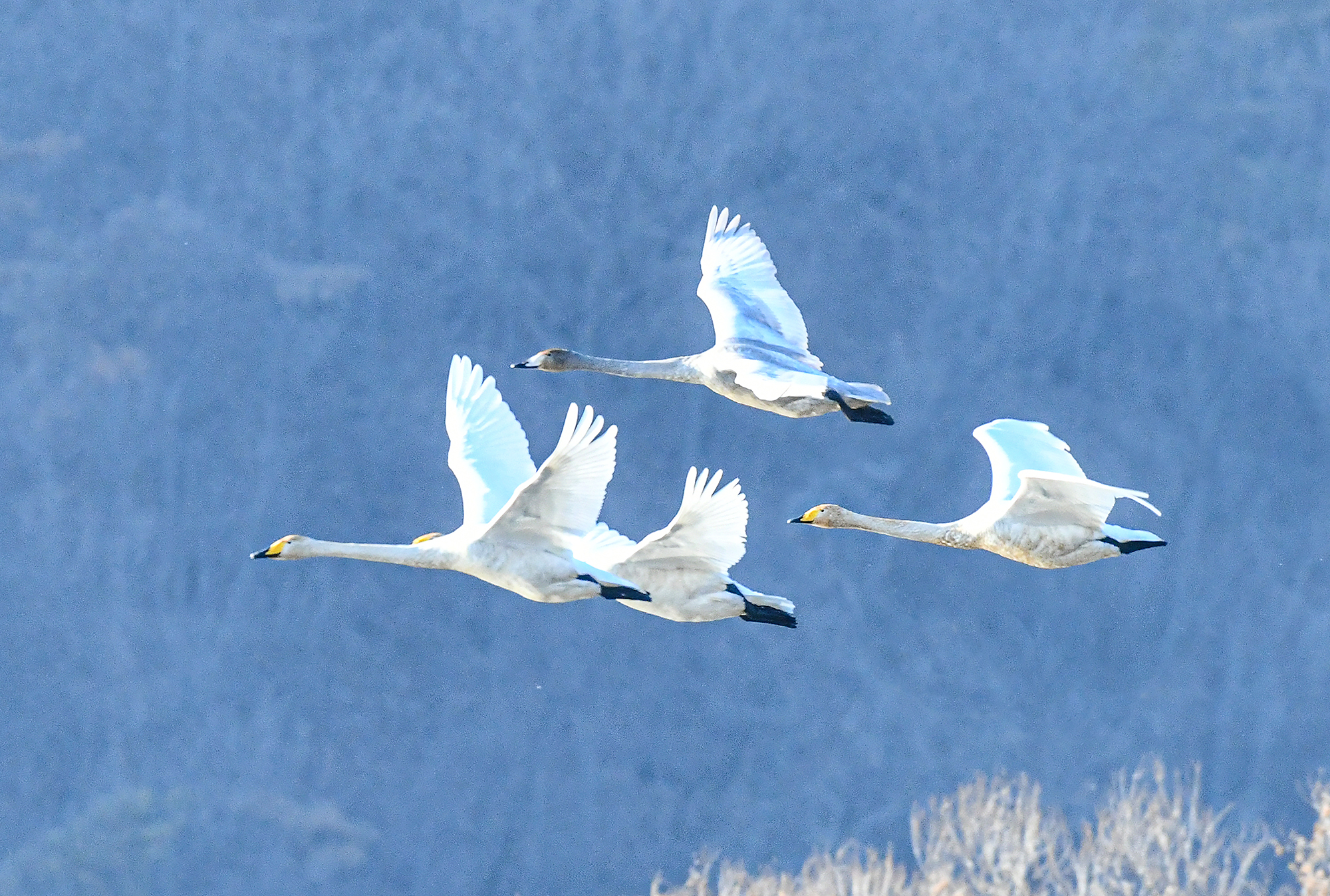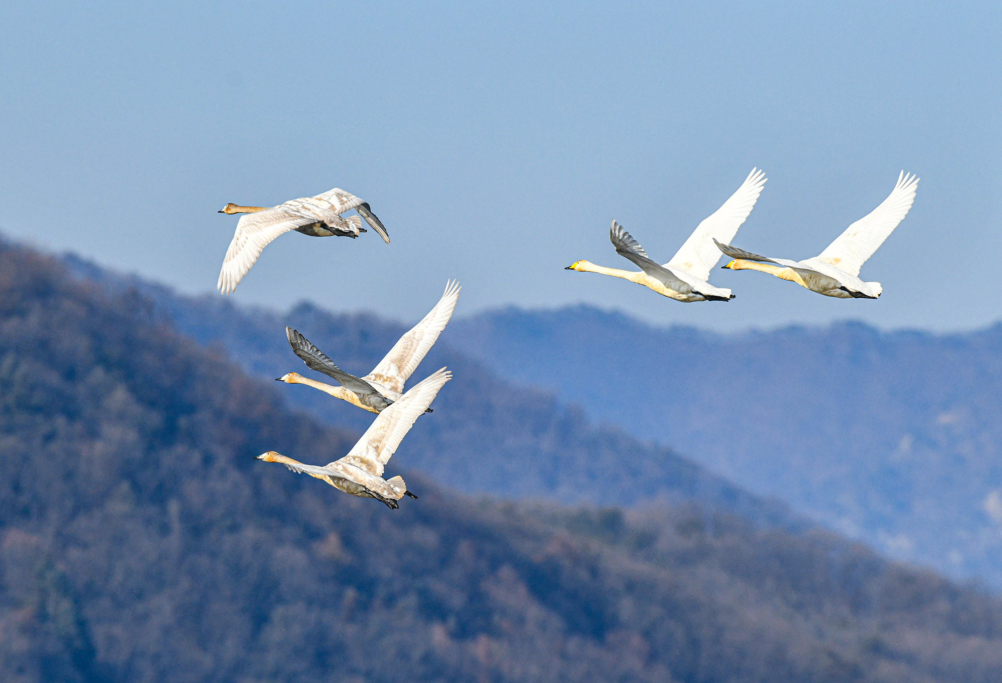 둑방에서 촬영했다, 강 건너 산 아래 강에는 고니 수백마리가