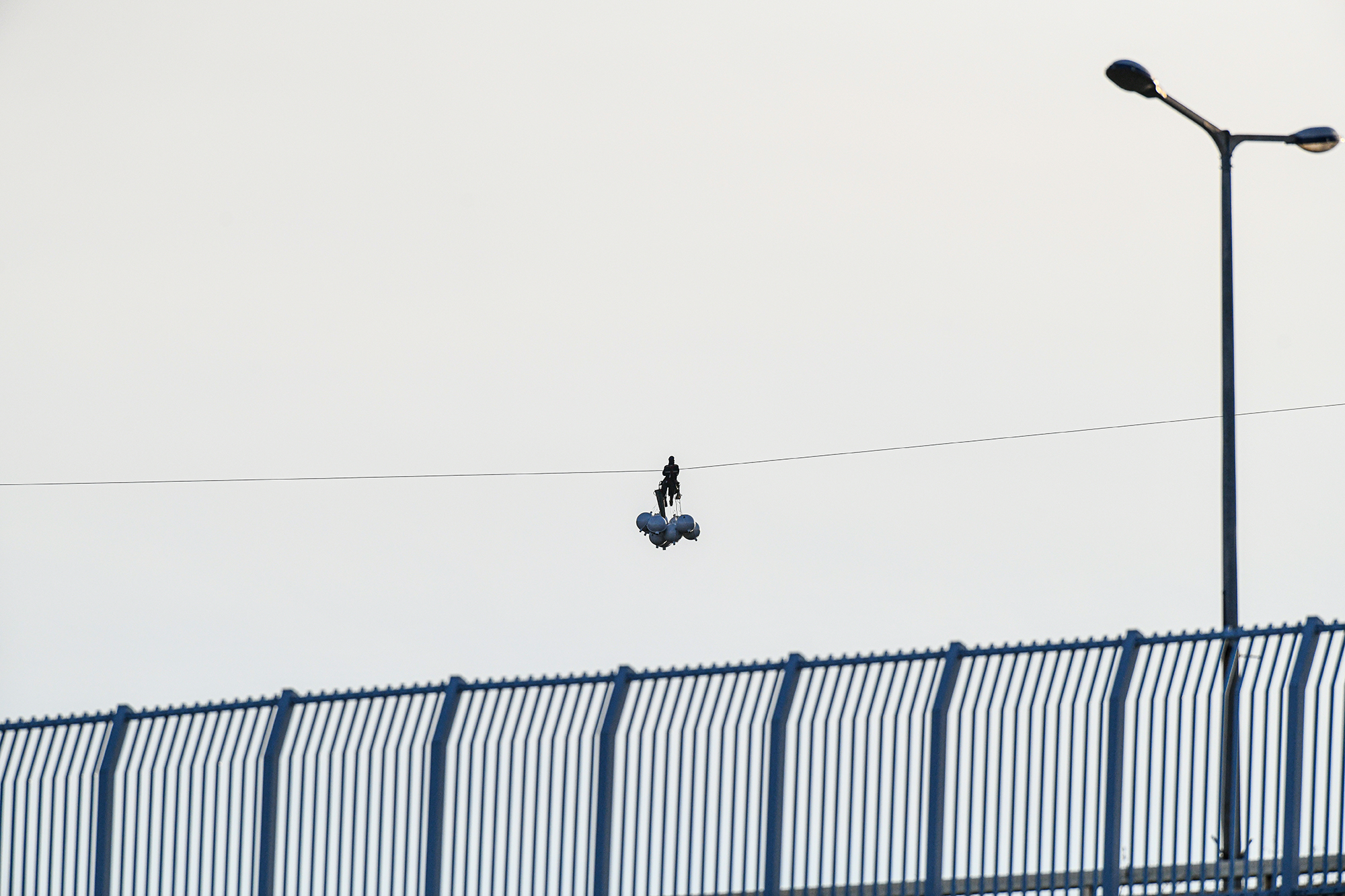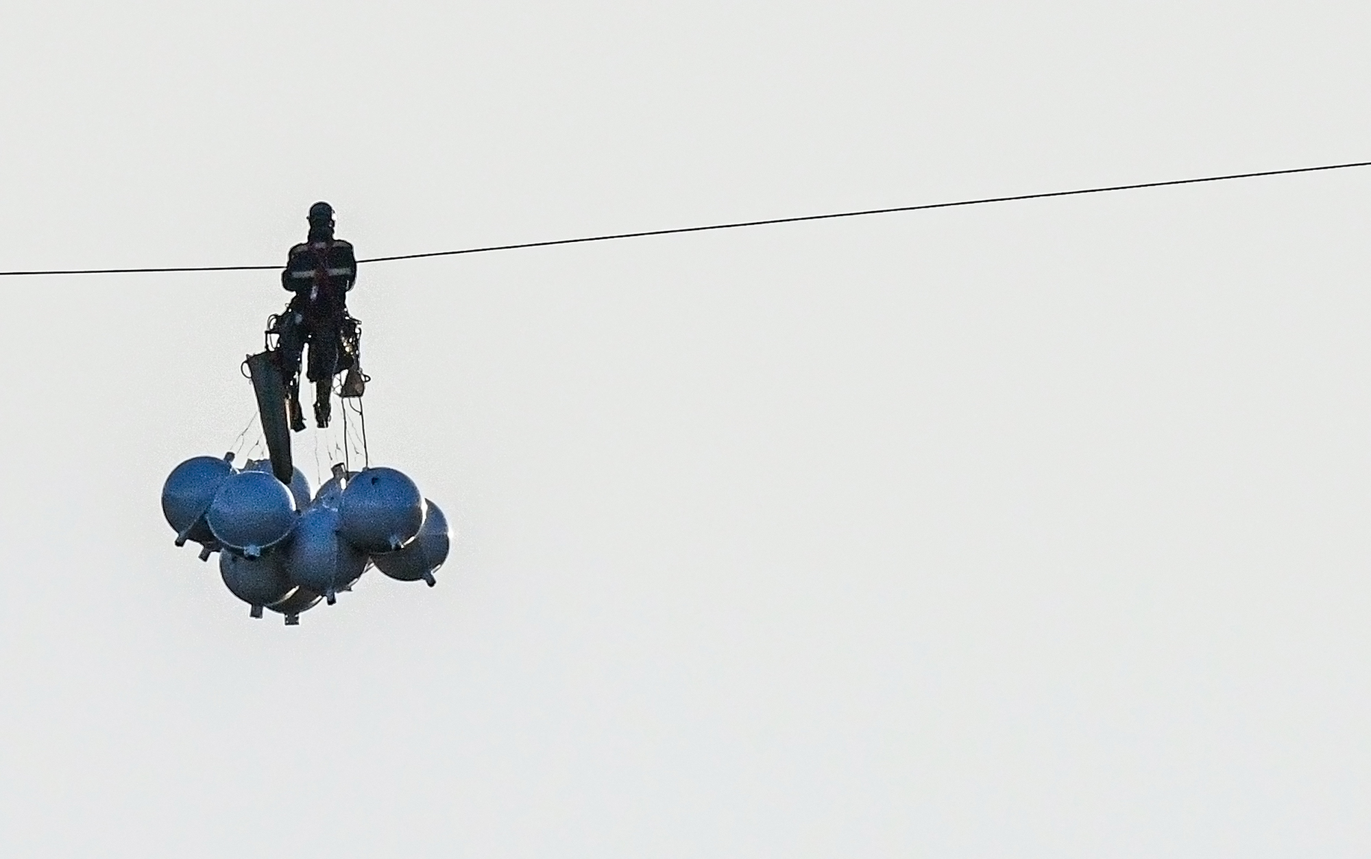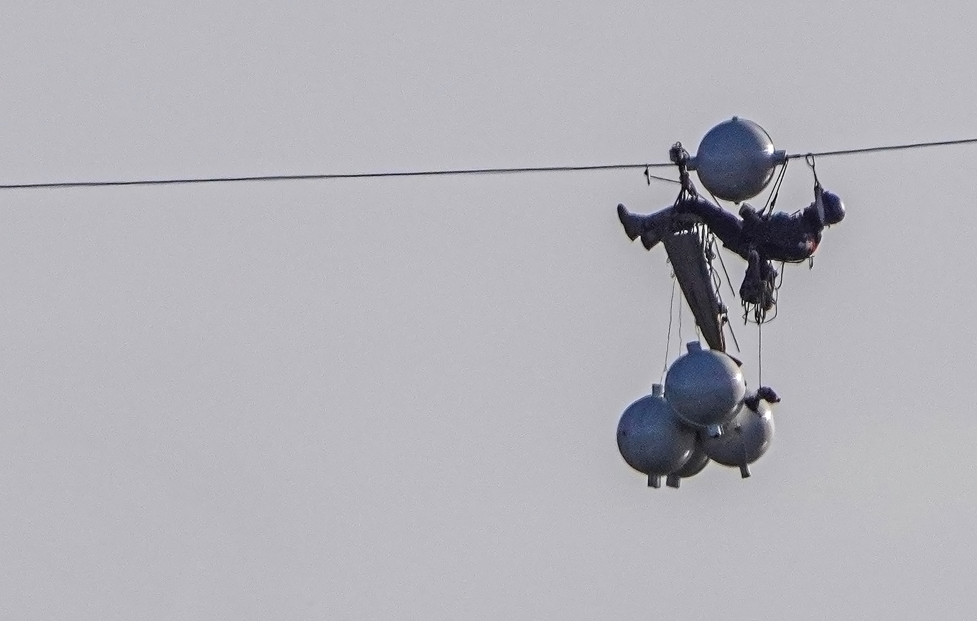 고압송전선에 매달려 전선에 무엇인가를 설치하는 모습