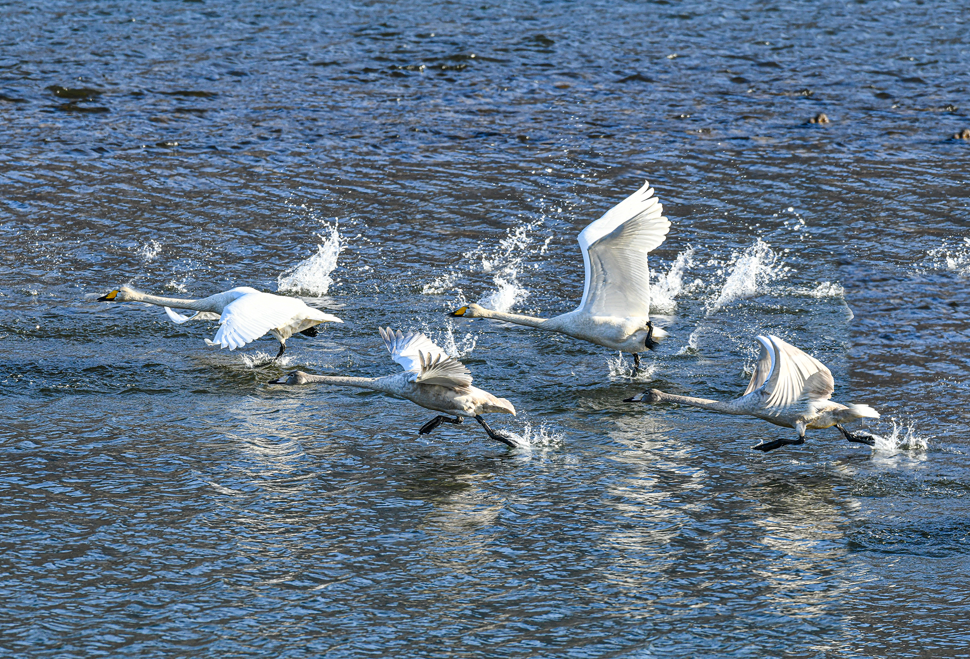 언제 날지 알수는 없으나 고니가 물을 박차고 하늘로