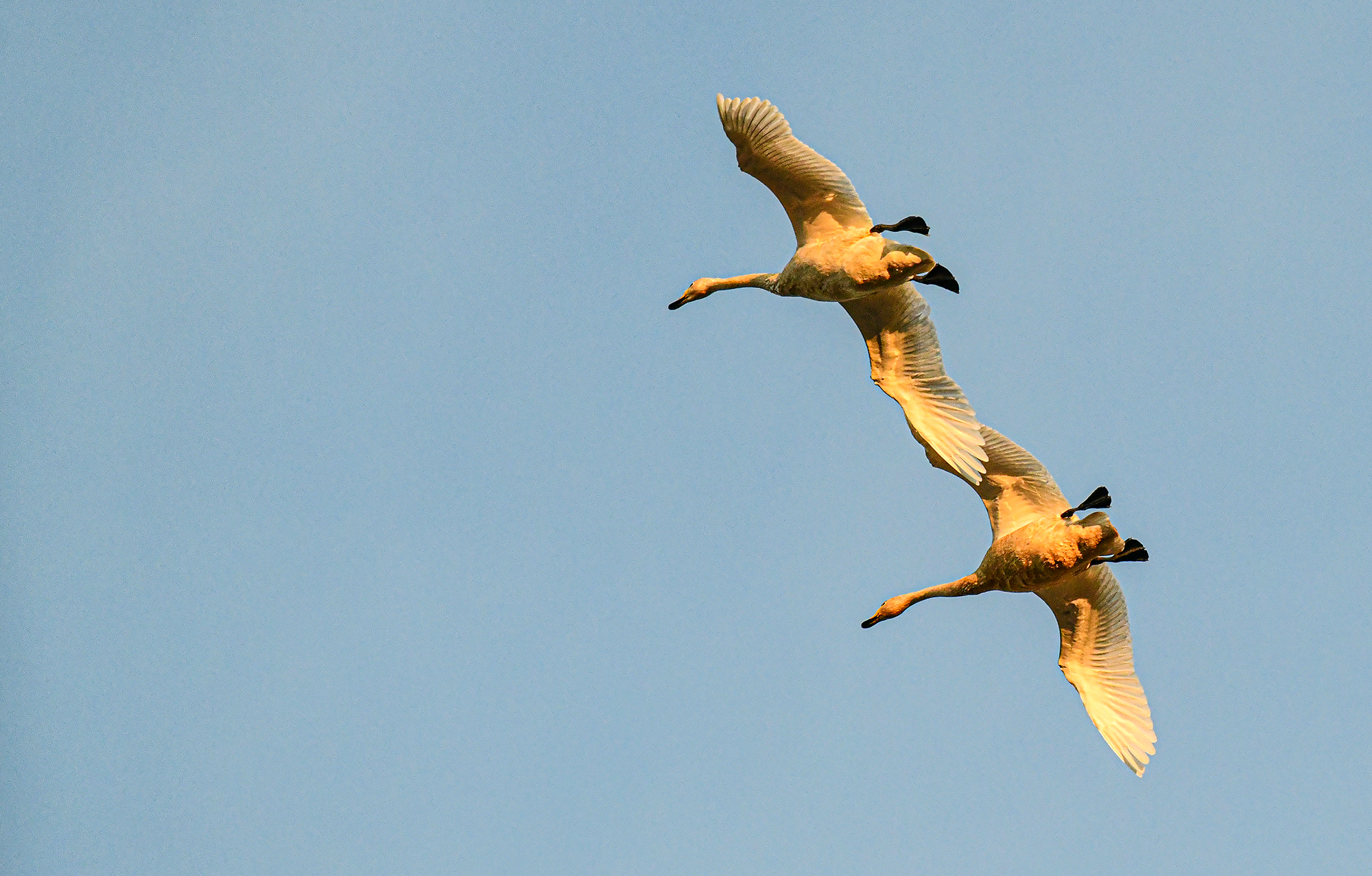 해뜬 직후 붉은 빛을 받은 고니가 날아오고 있다,