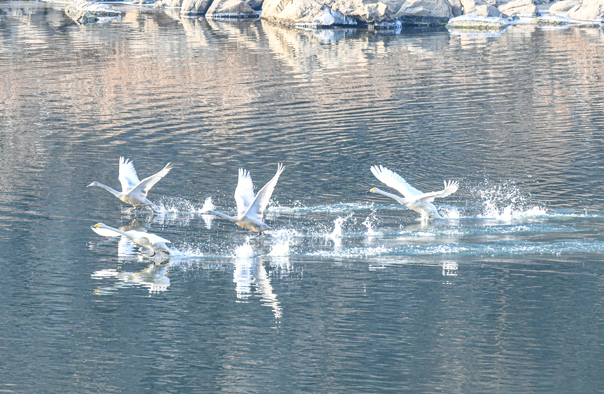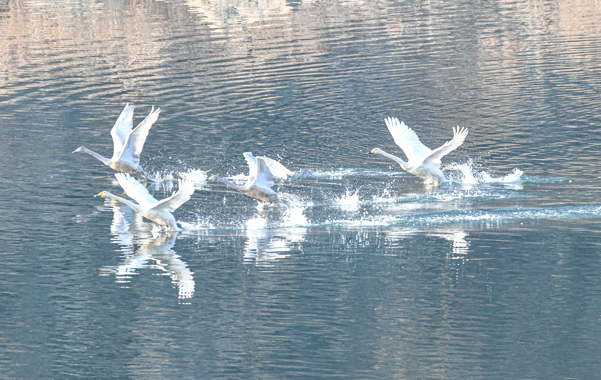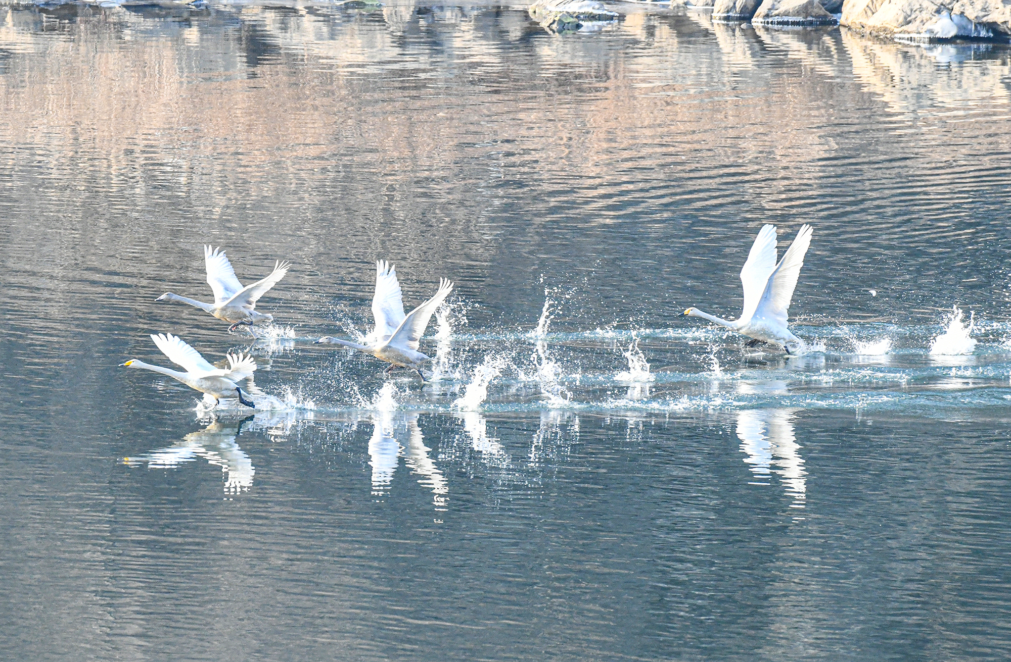 물 위를 유유히 유영하던 한 무리의 고니가 물을 거슬러