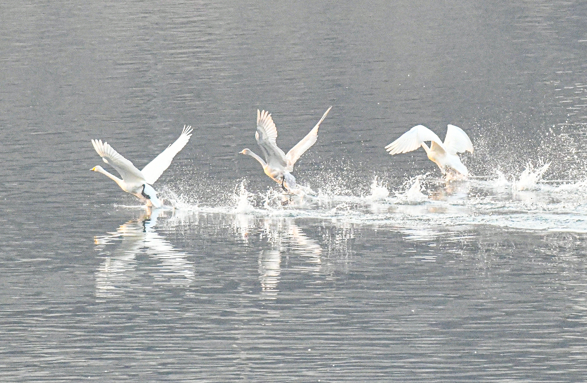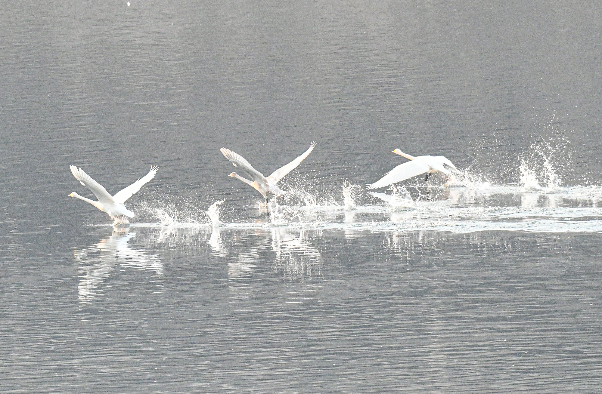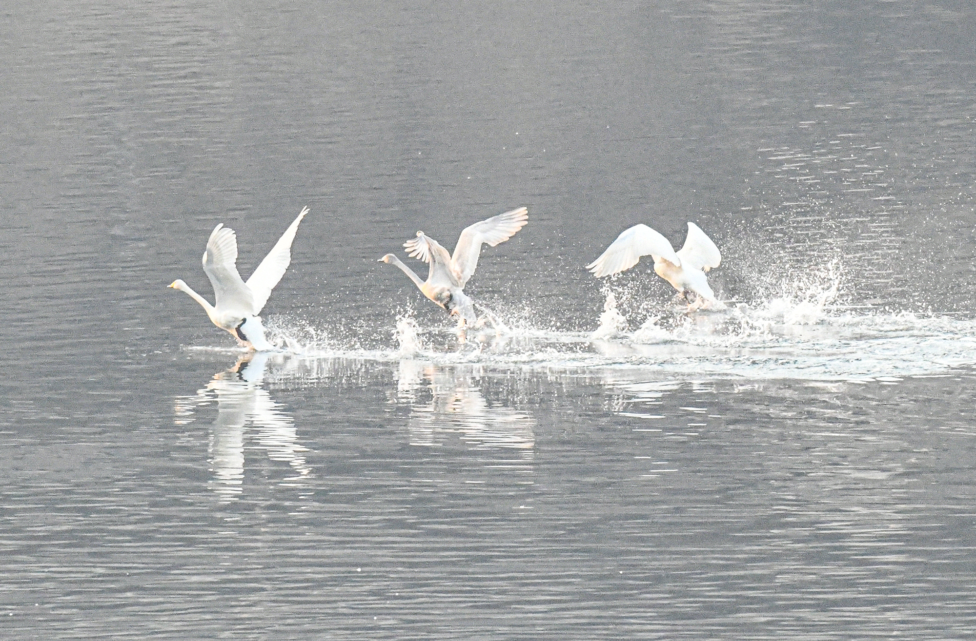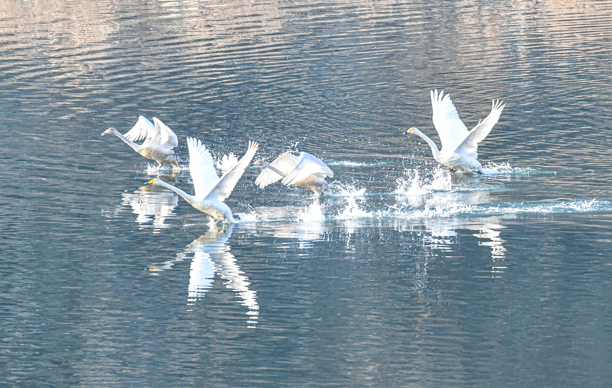 물 위를 유유히 유영하던 한 무리의 고니가 물을 거슬러
