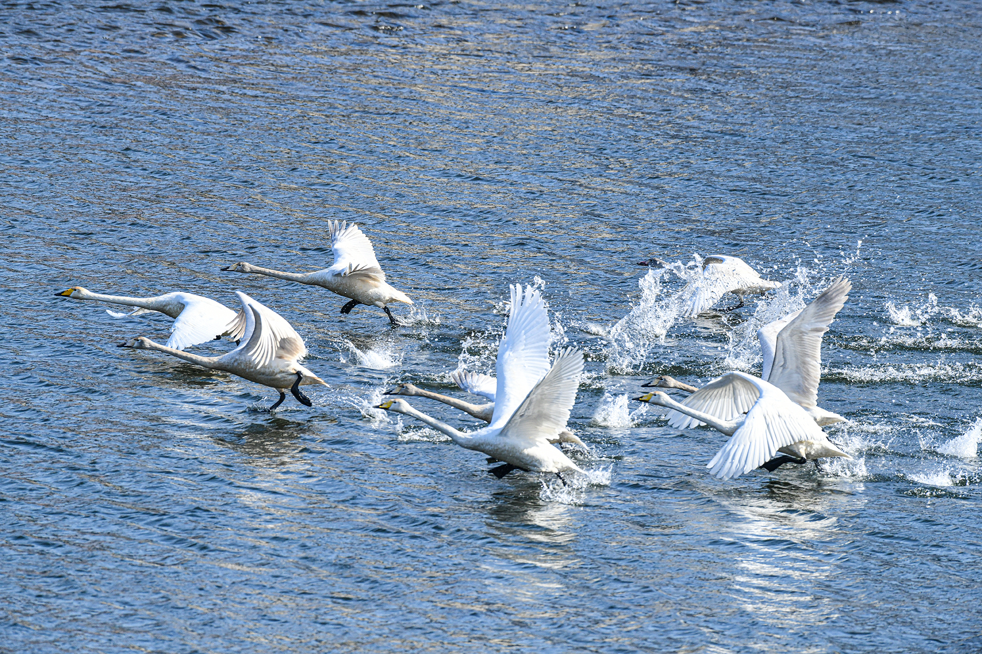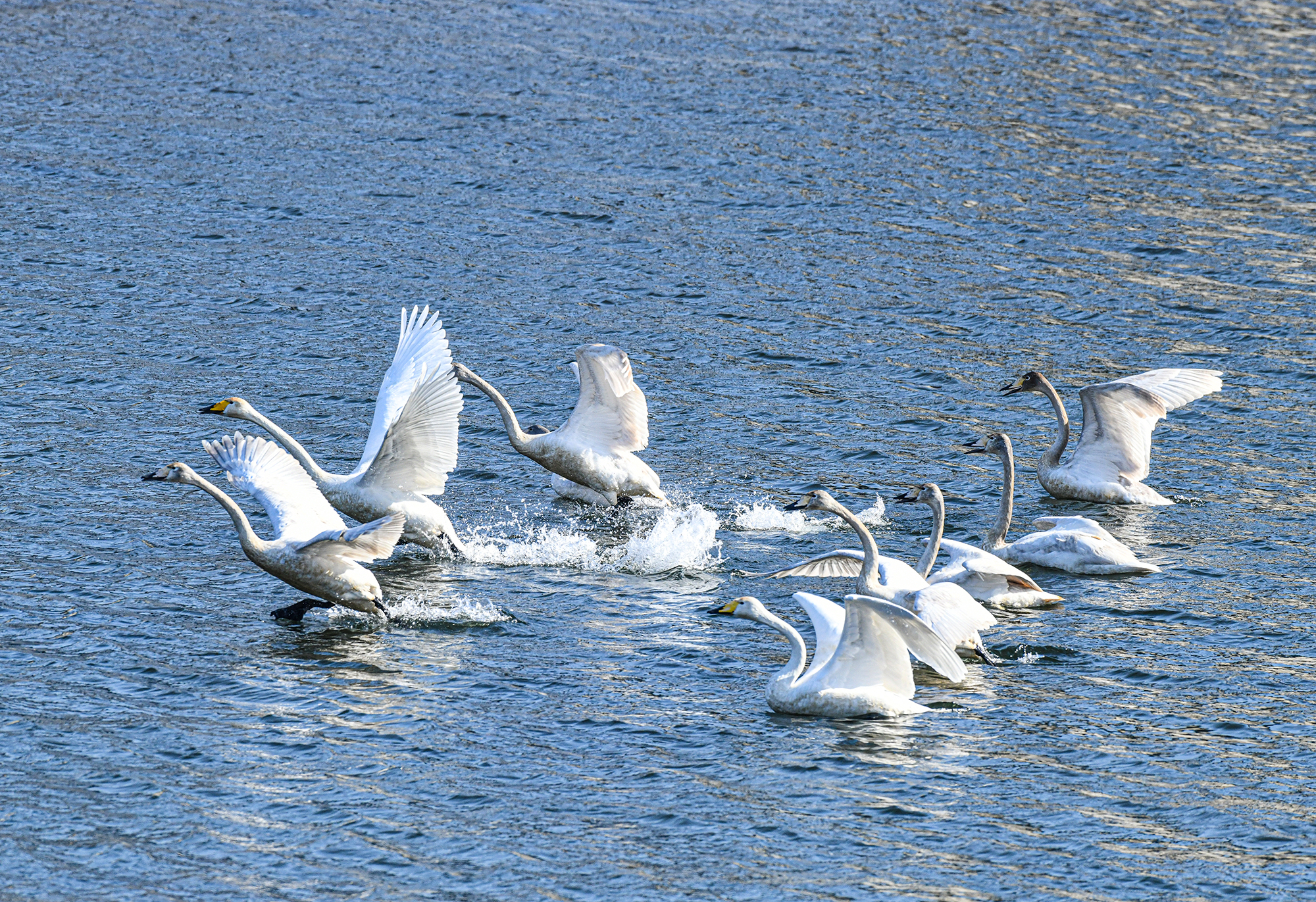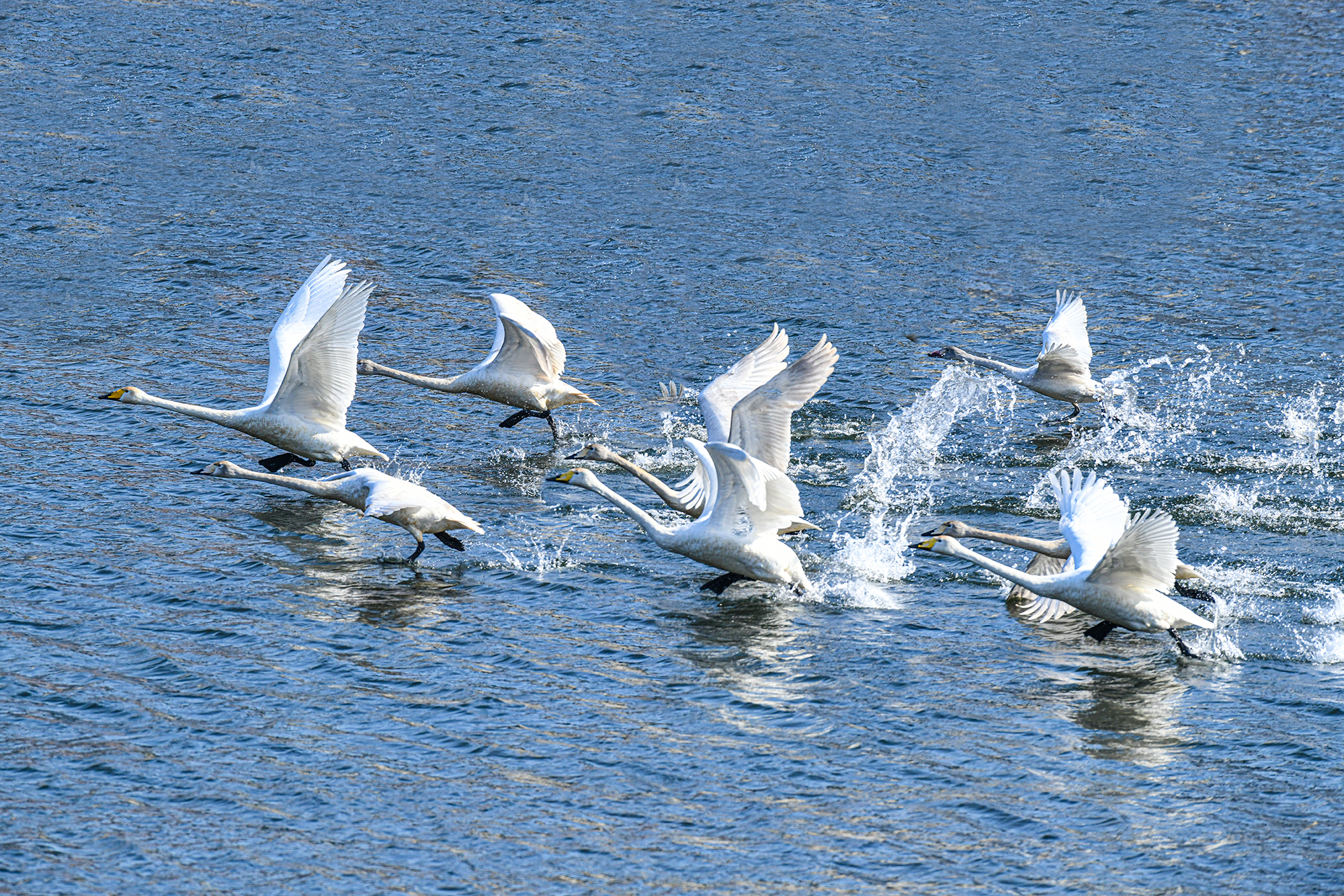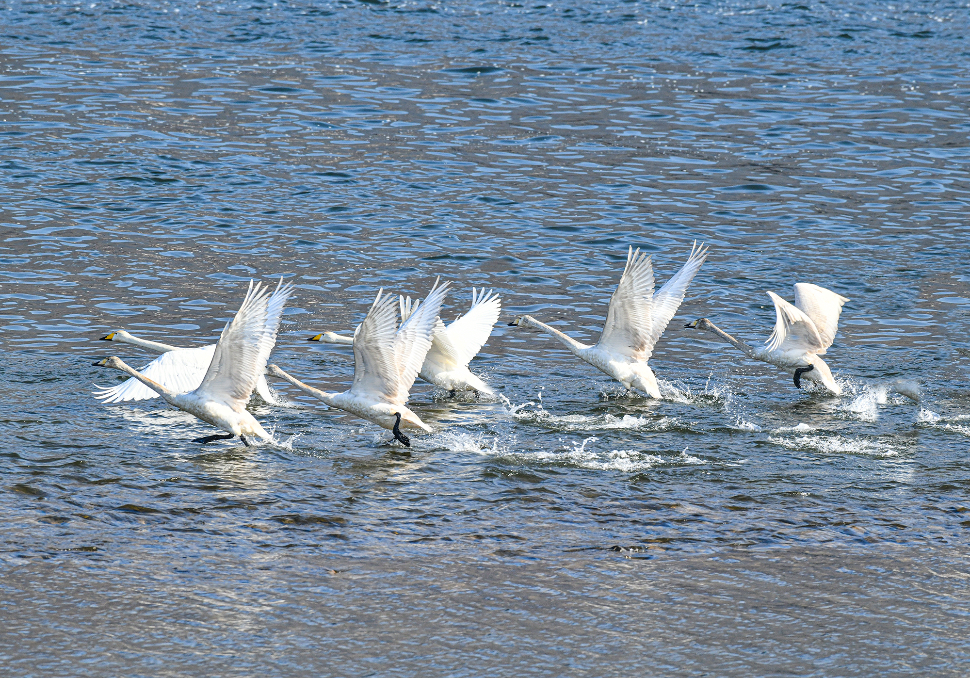 언제 날지 알수는 없으나 고니가 물을 박차고 하늘로 날아