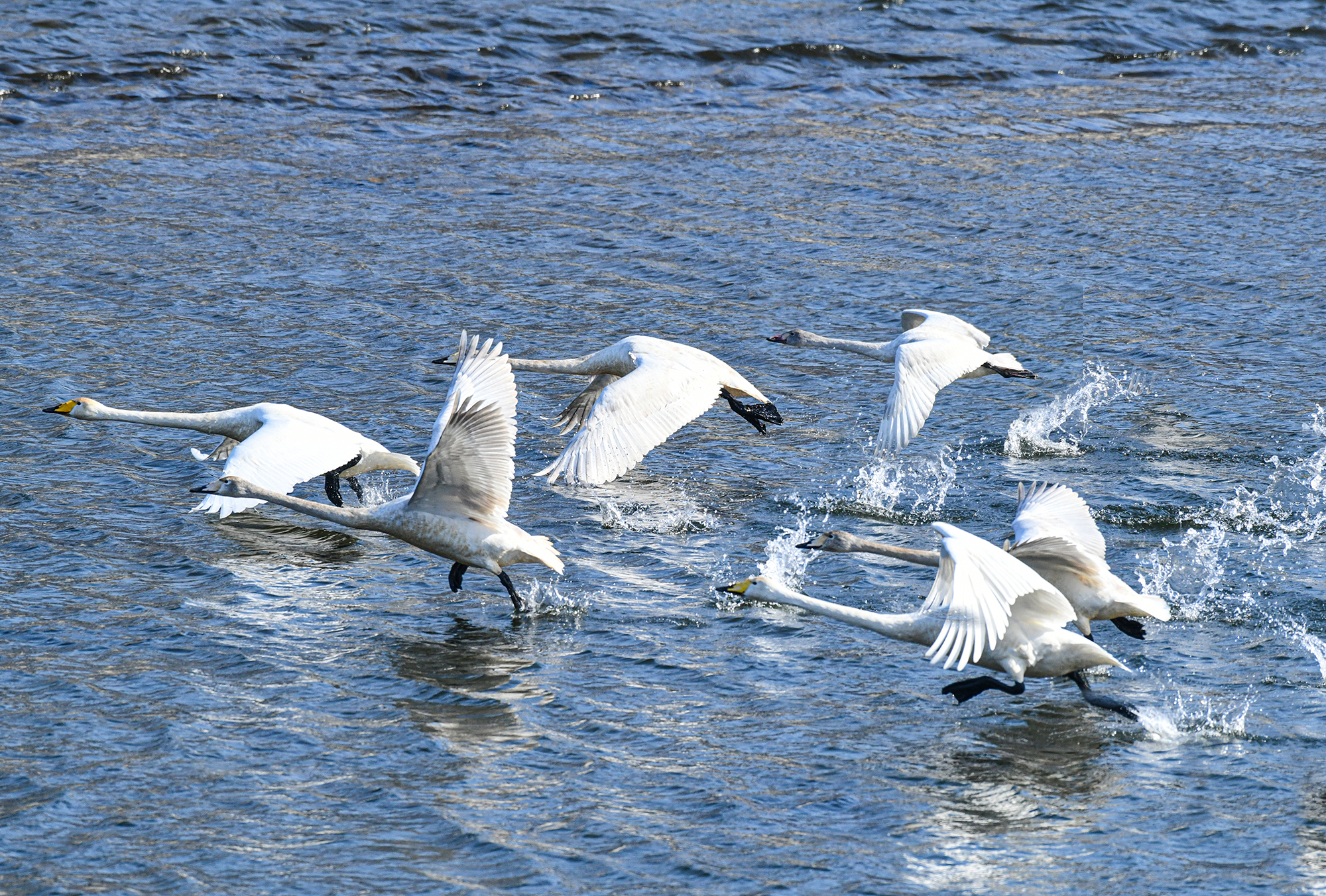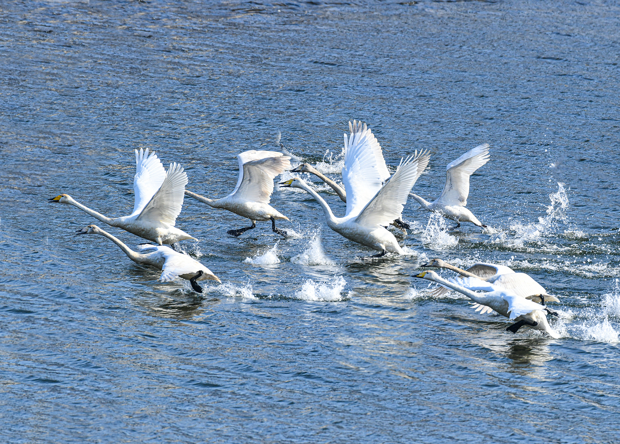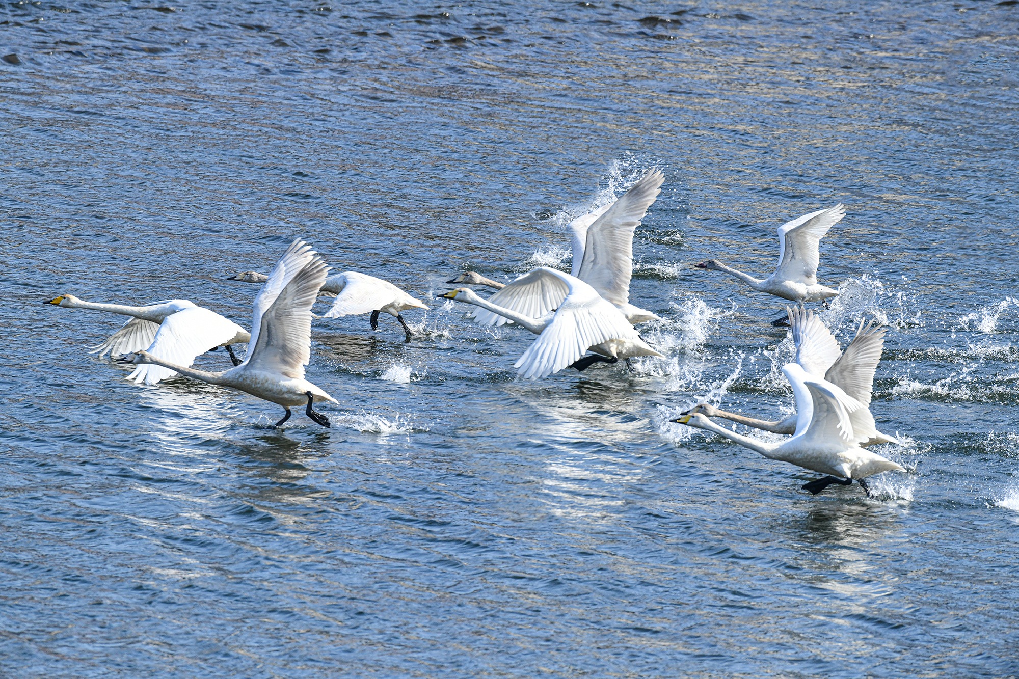 언제 날지 알수는 없으나 고니가 물을 박차고 하늘로 날아