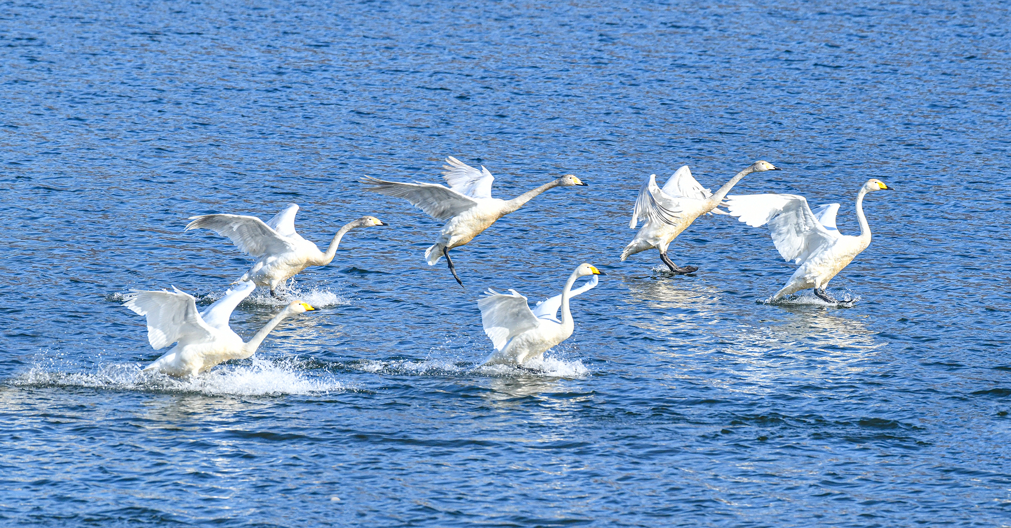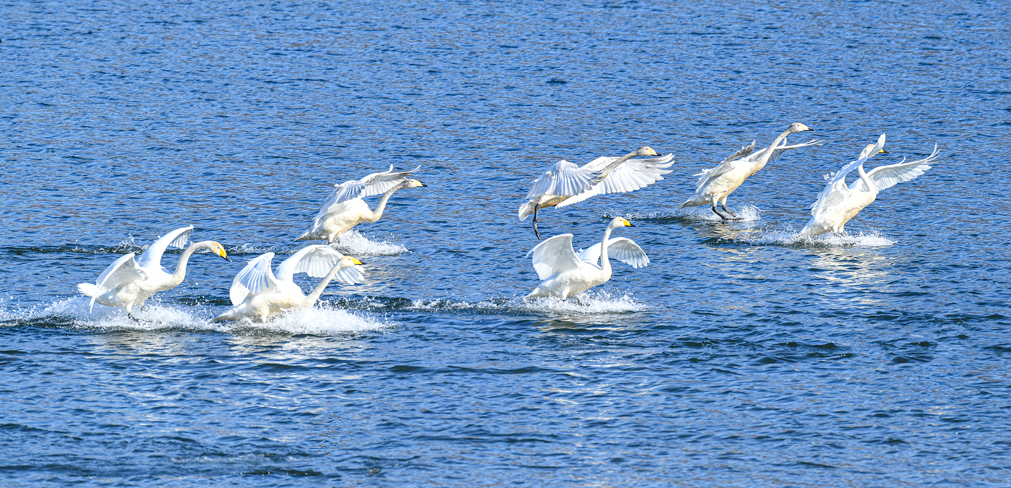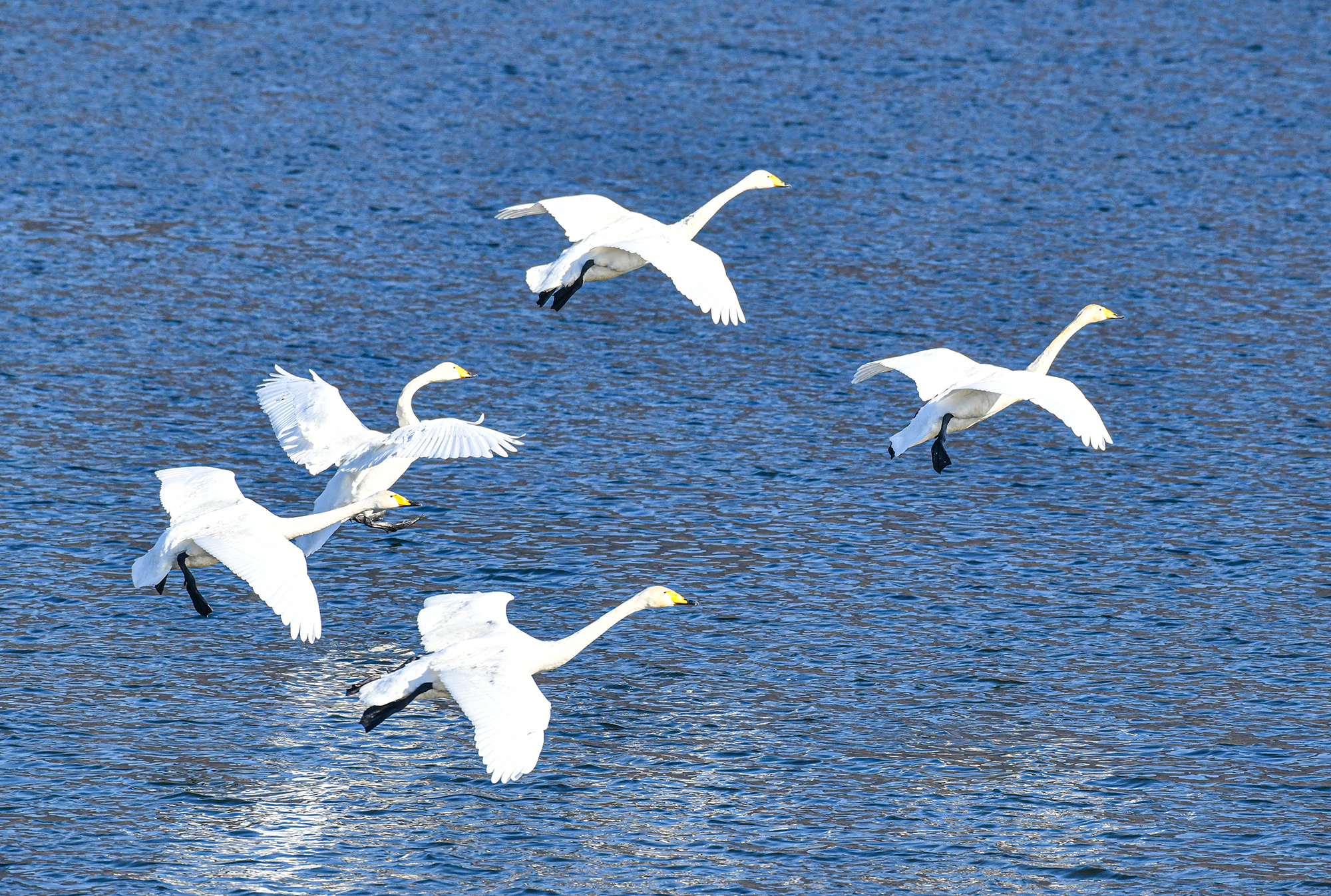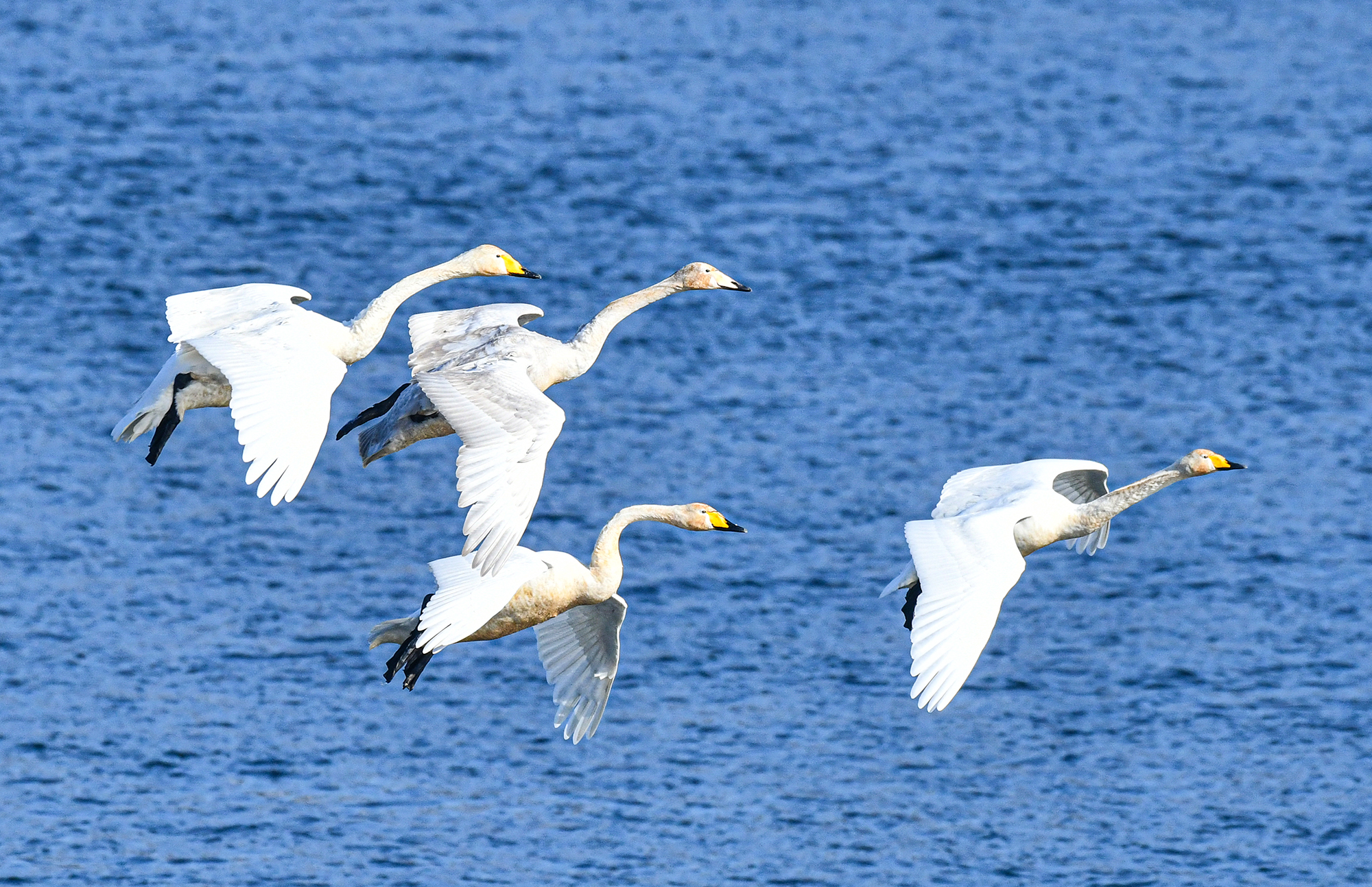 몇 마리씩 무리지어 날기 시작했다, 고니 옆에서 고니가 하늘로